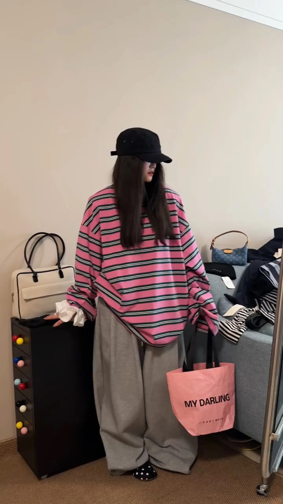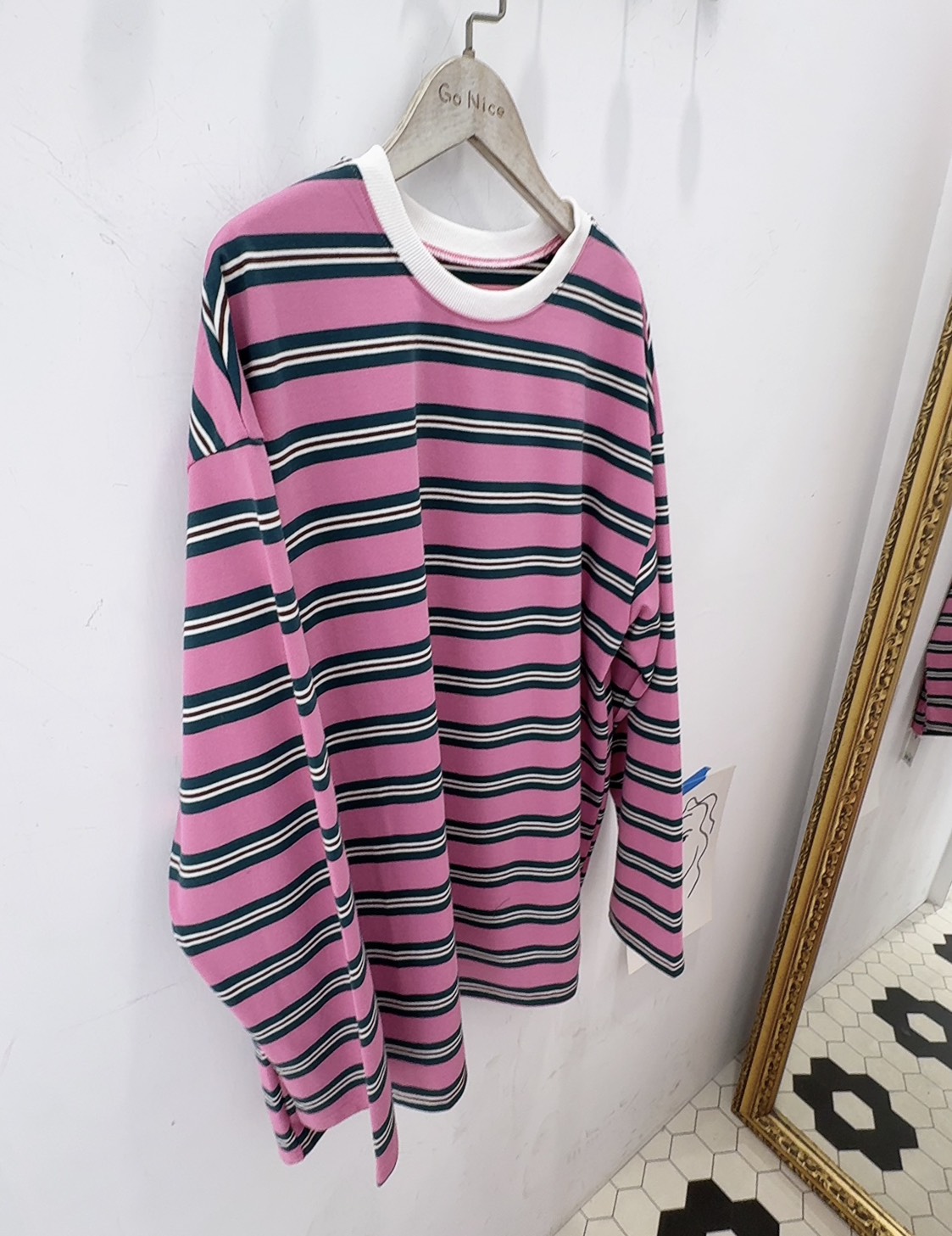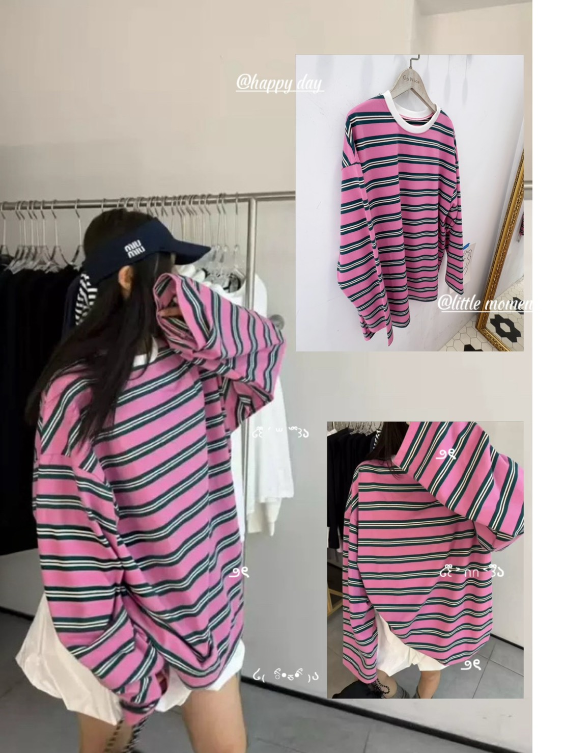 粉嫩粉色搭配深綠+白色細條紋