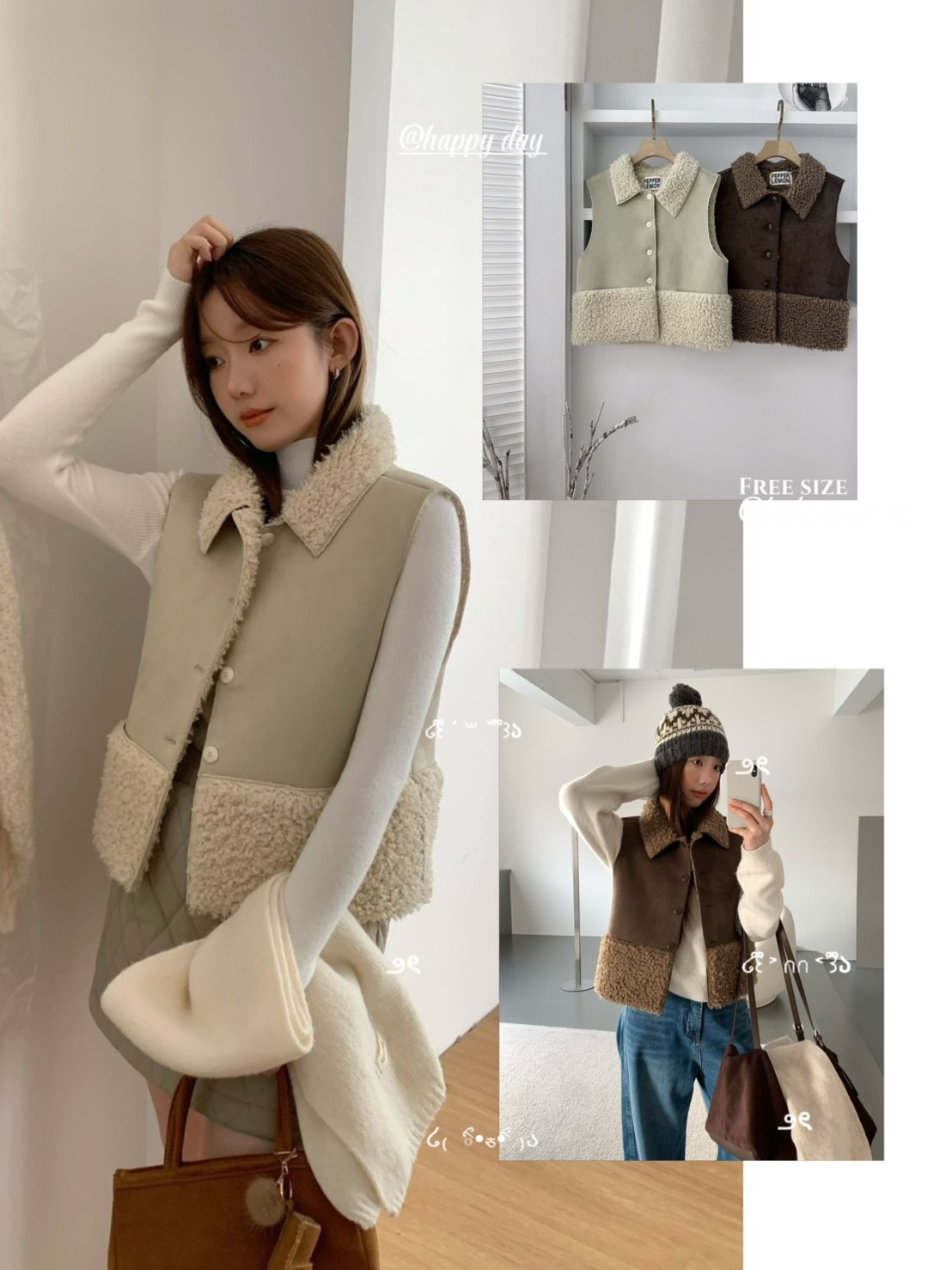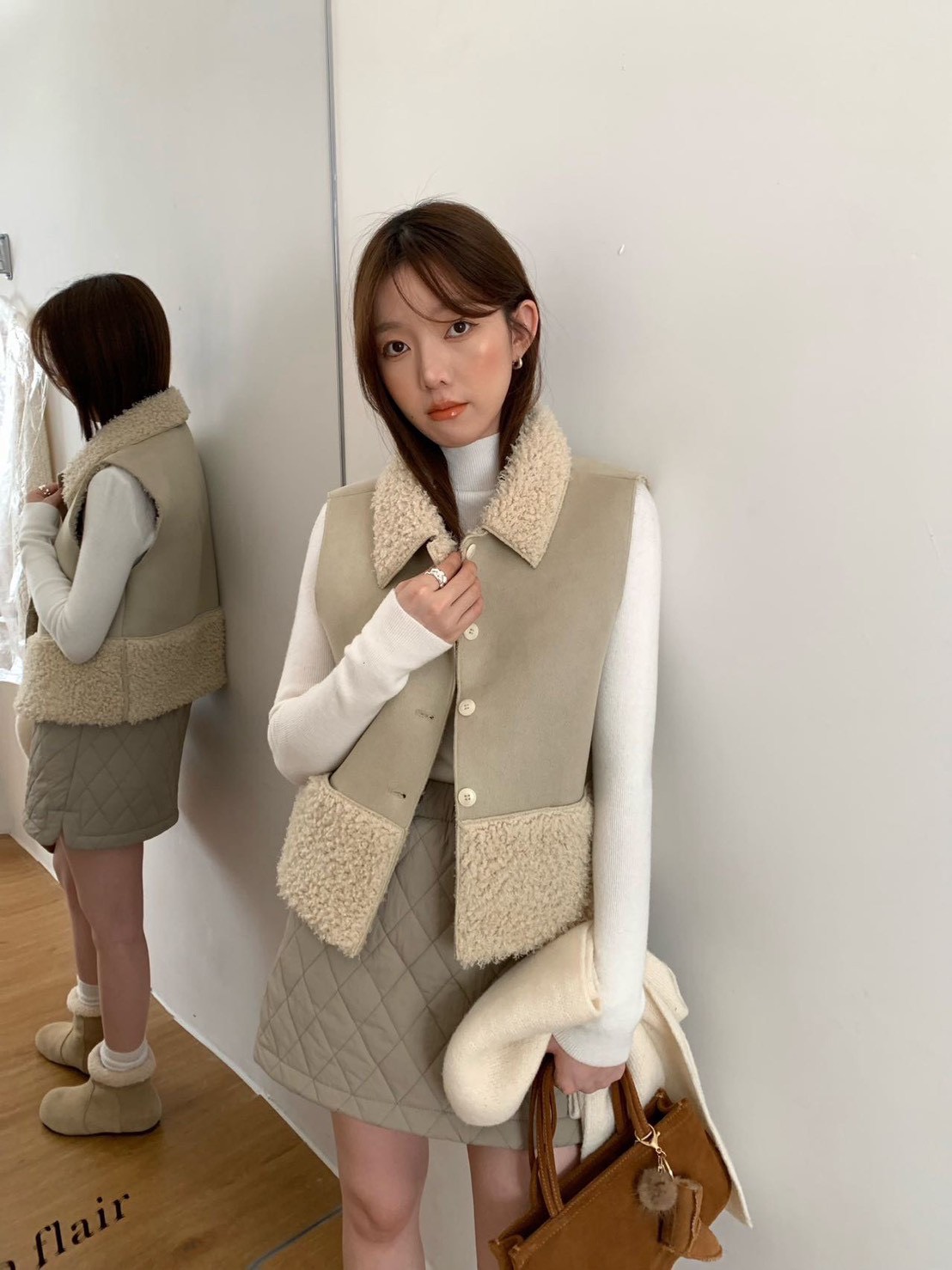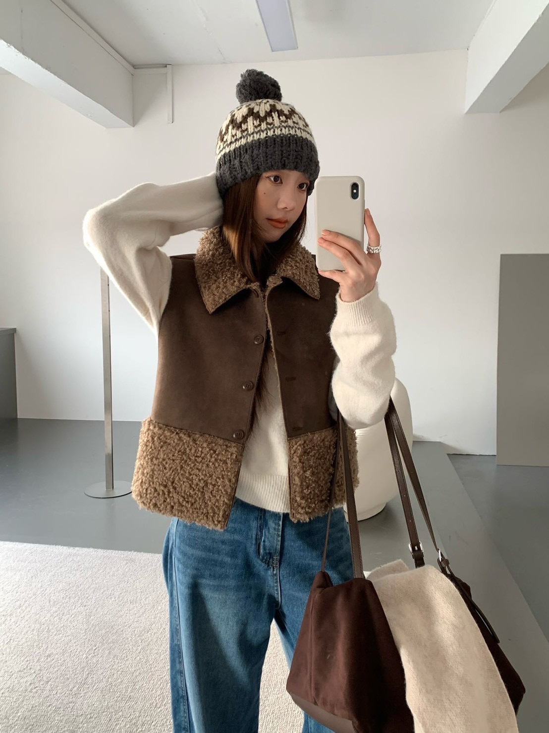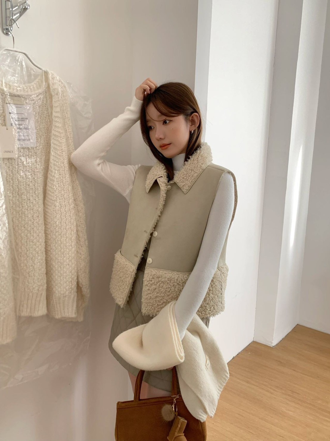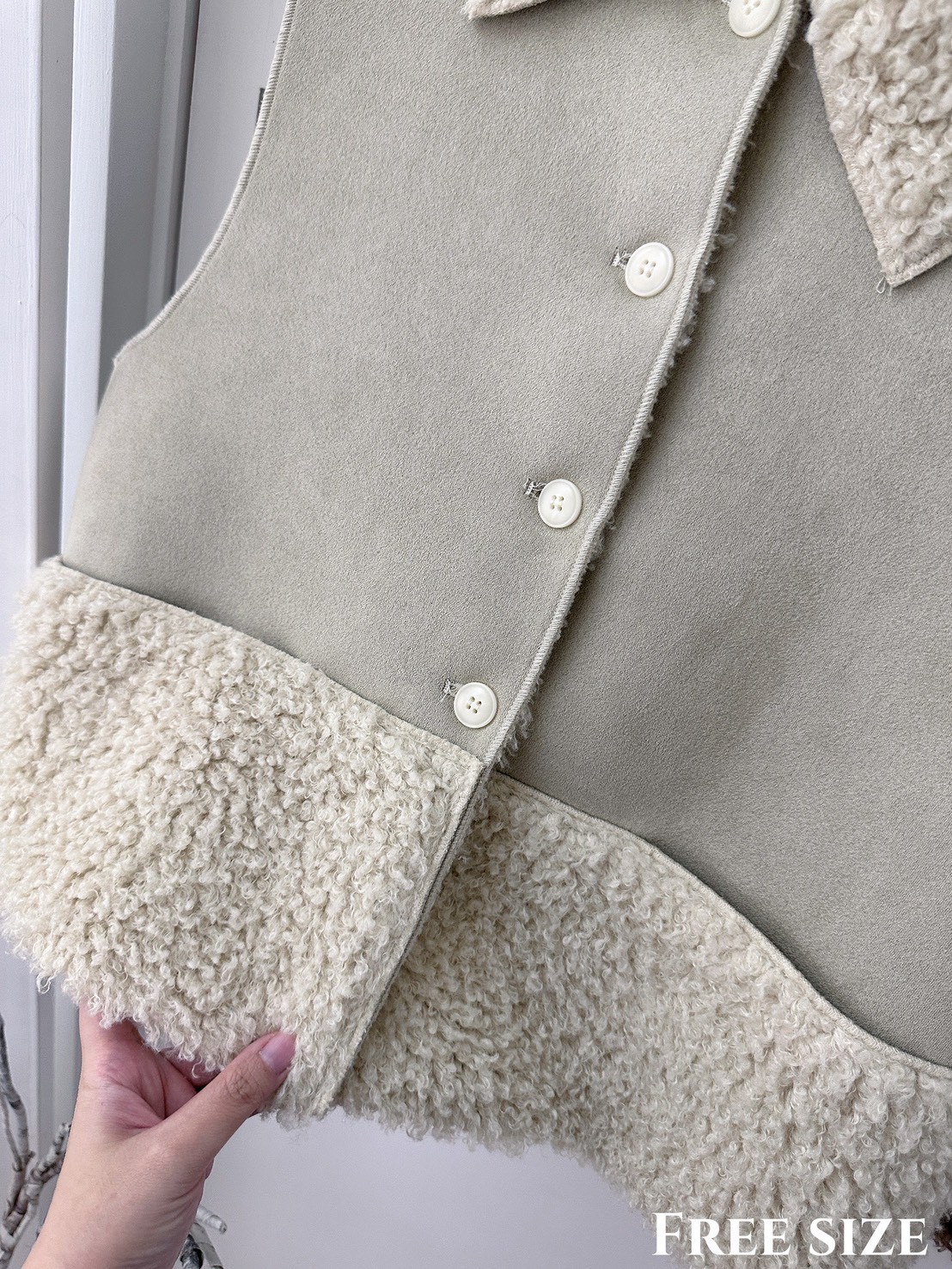 整件以霧感為基底,搭配下擺與領口的羊羔毛拼接