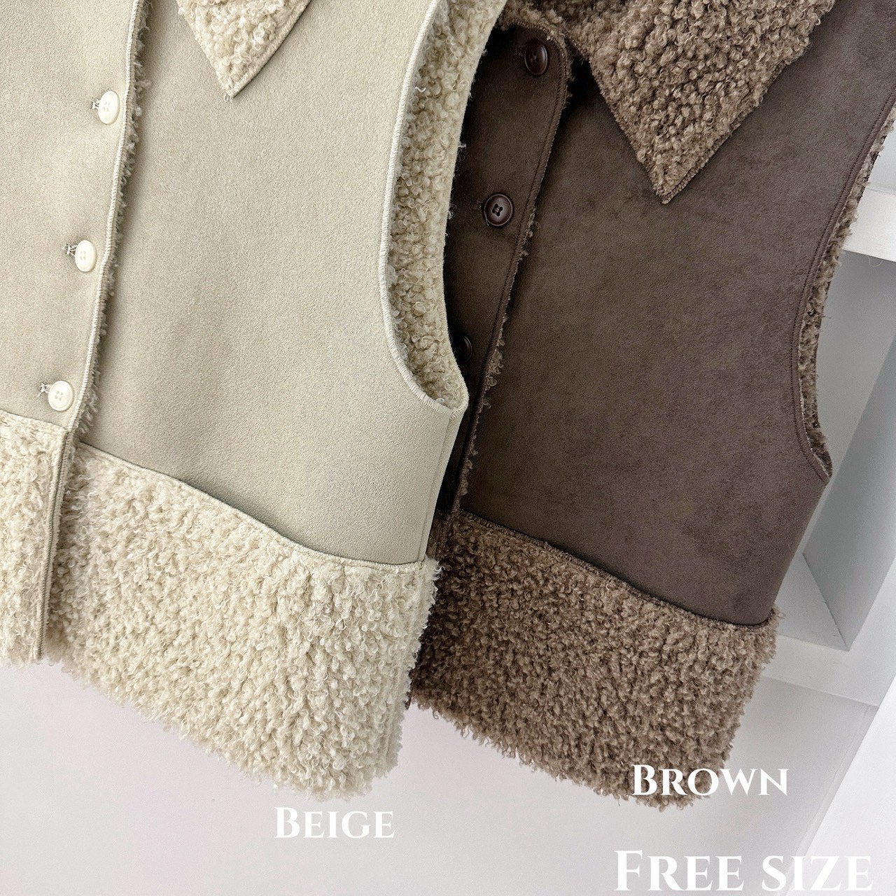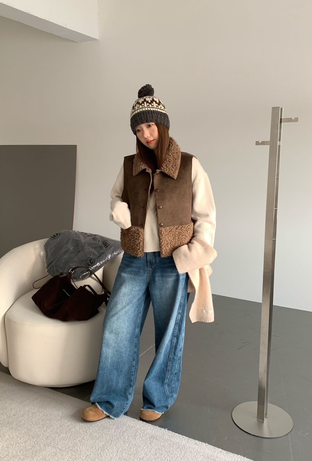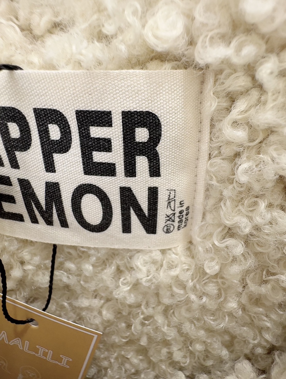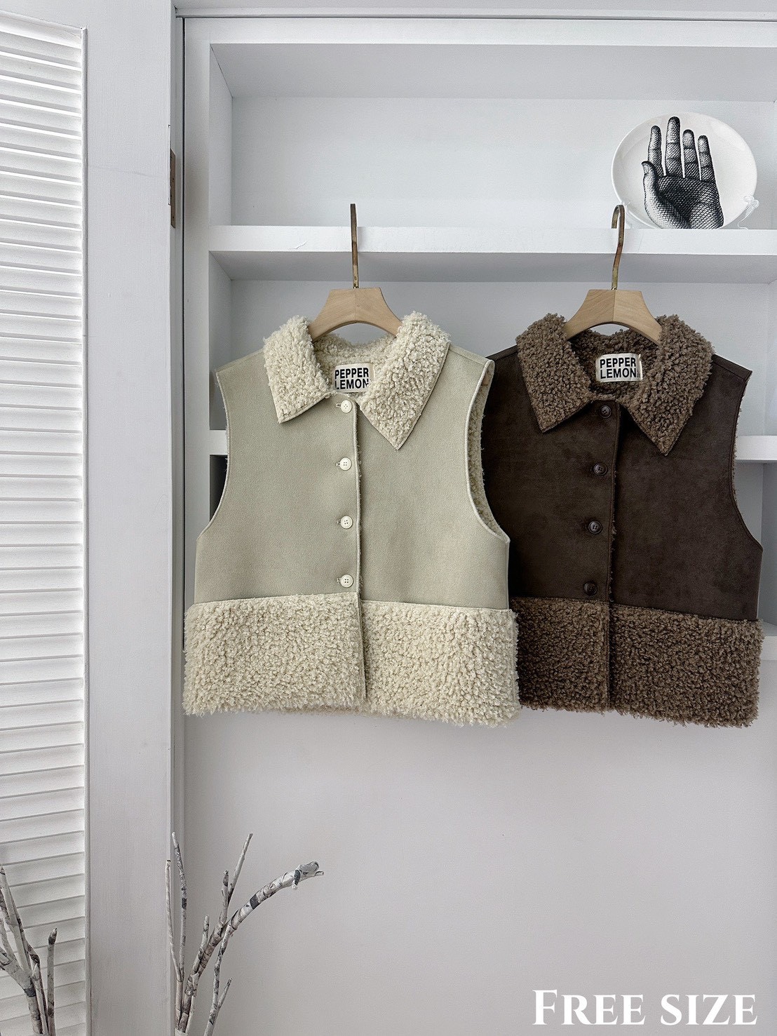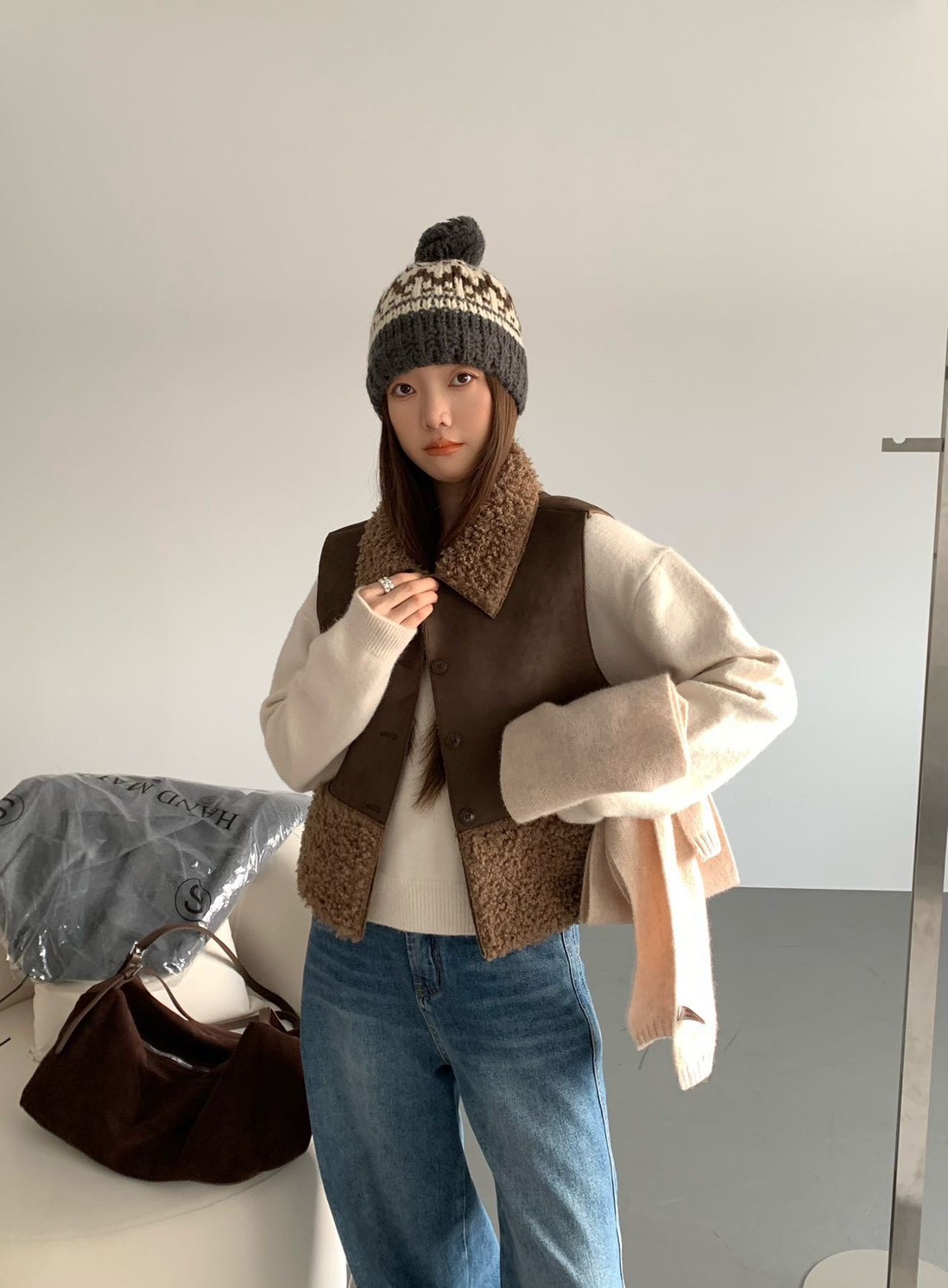 整件以霧感為基底,搭配下擺與領口的羊羔毛拼接