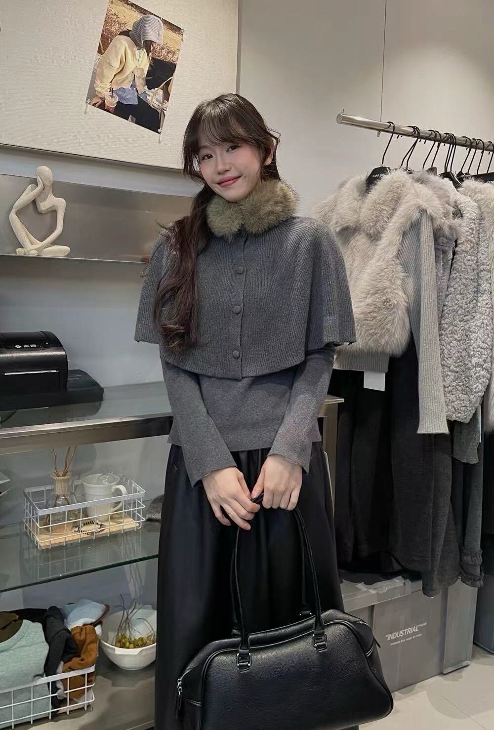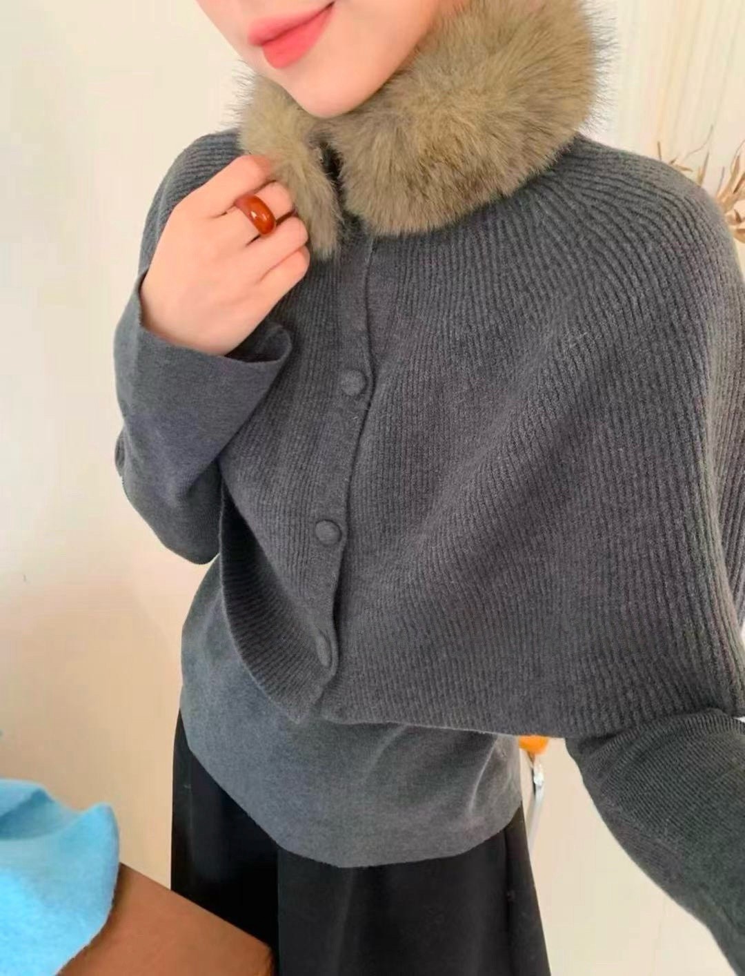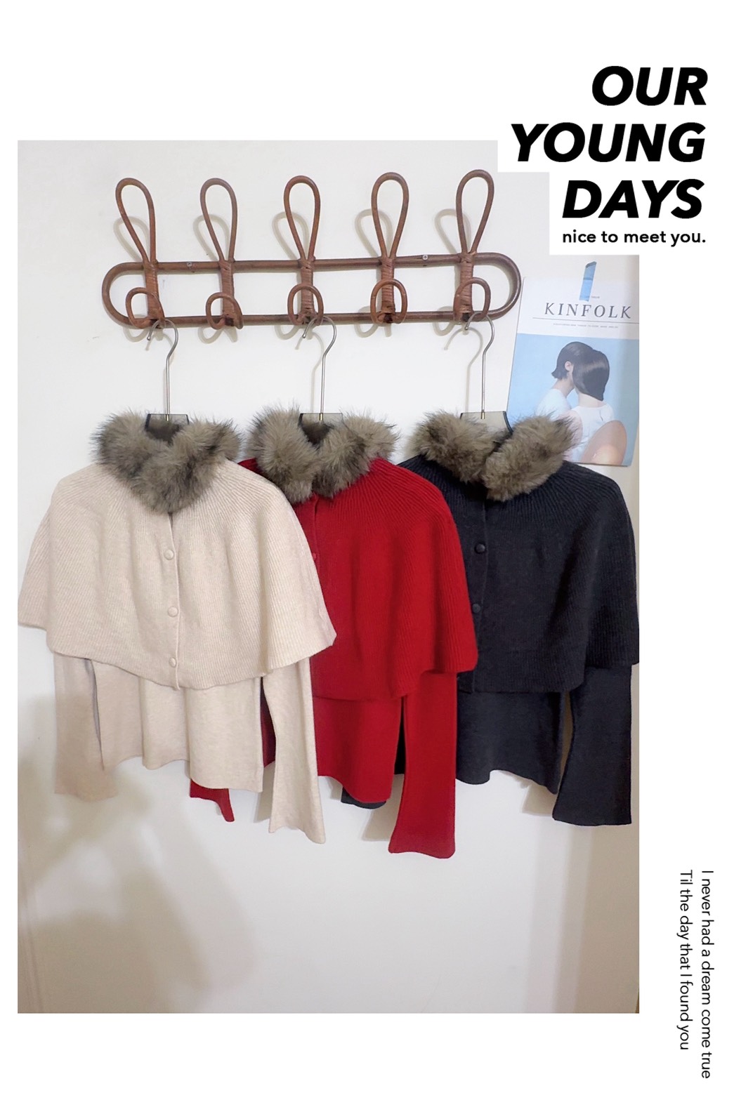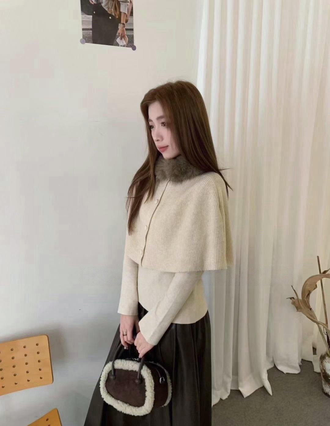 毛領披肩+小細節長袖喇叭袖針織衫」