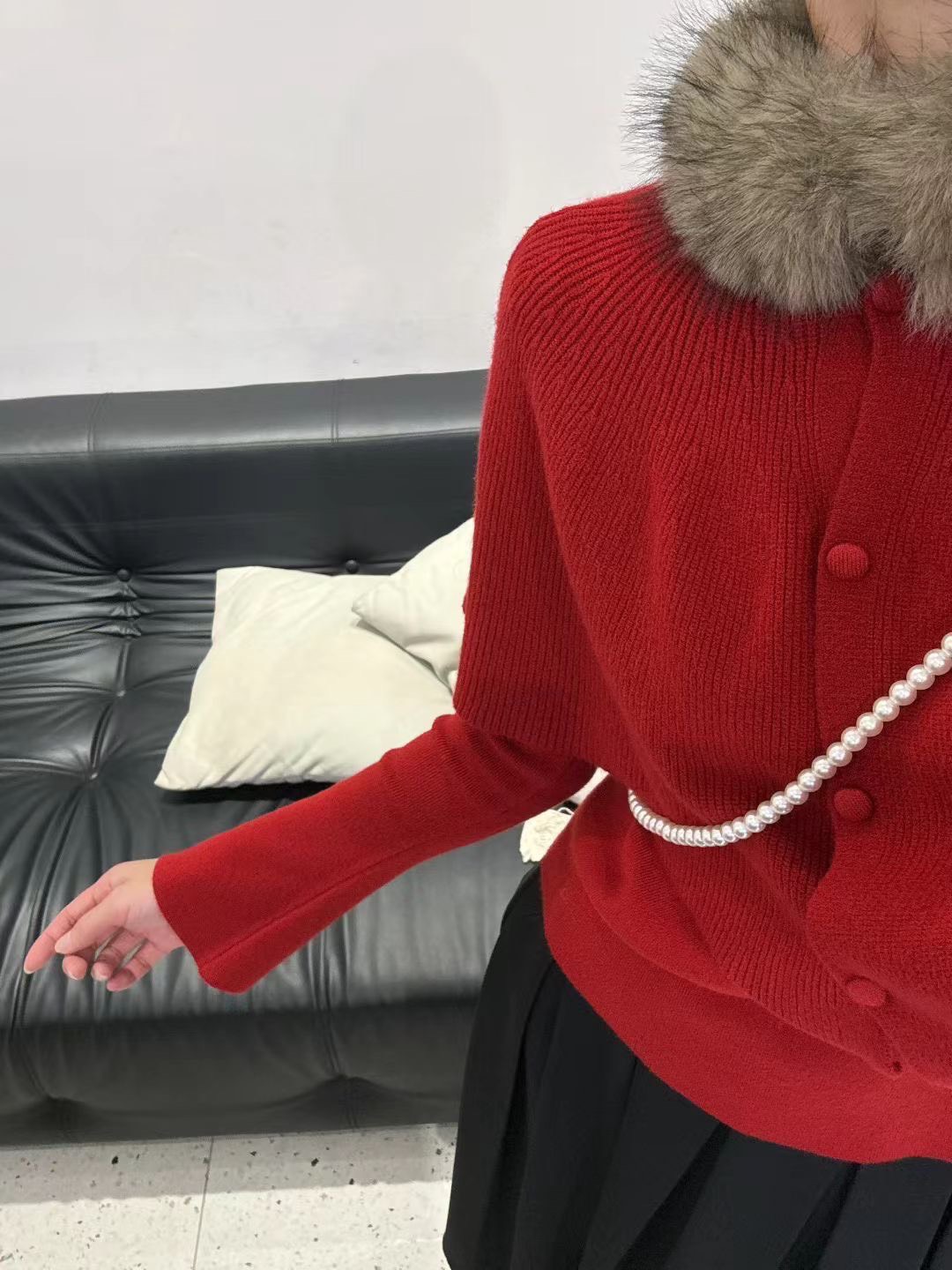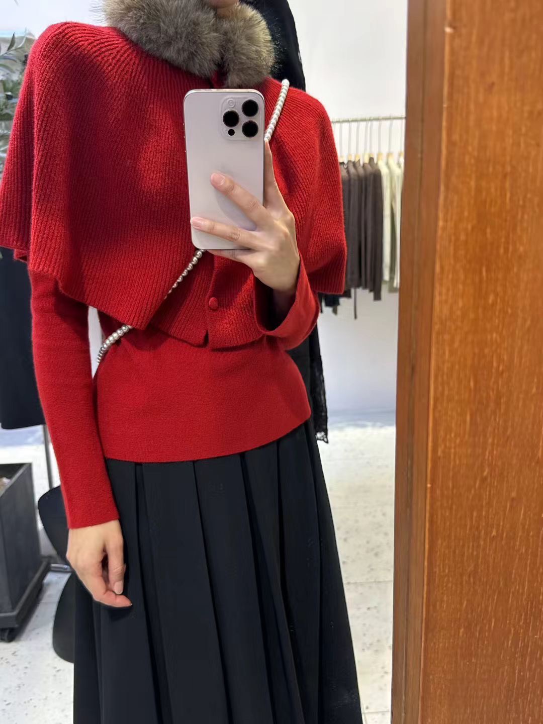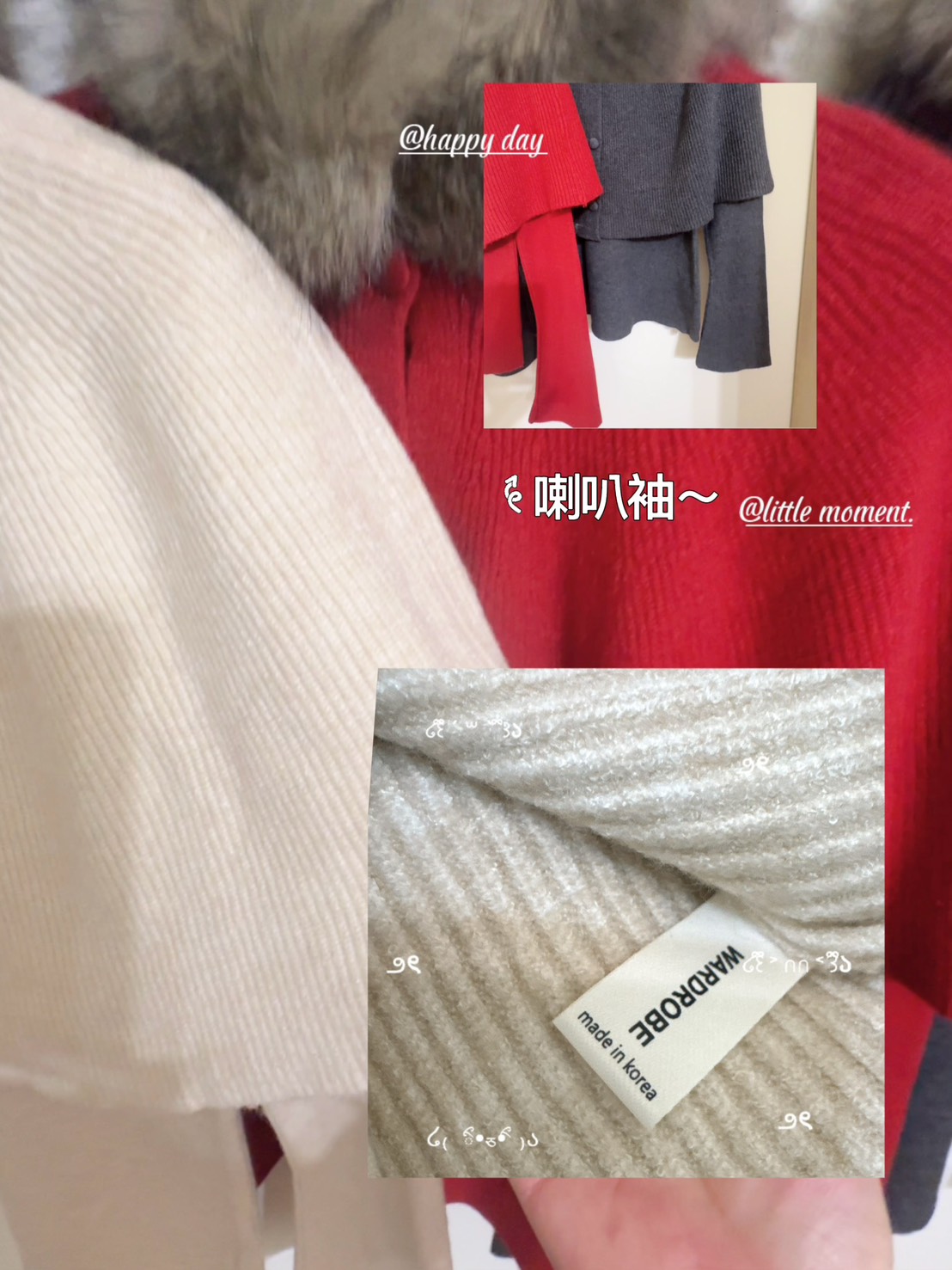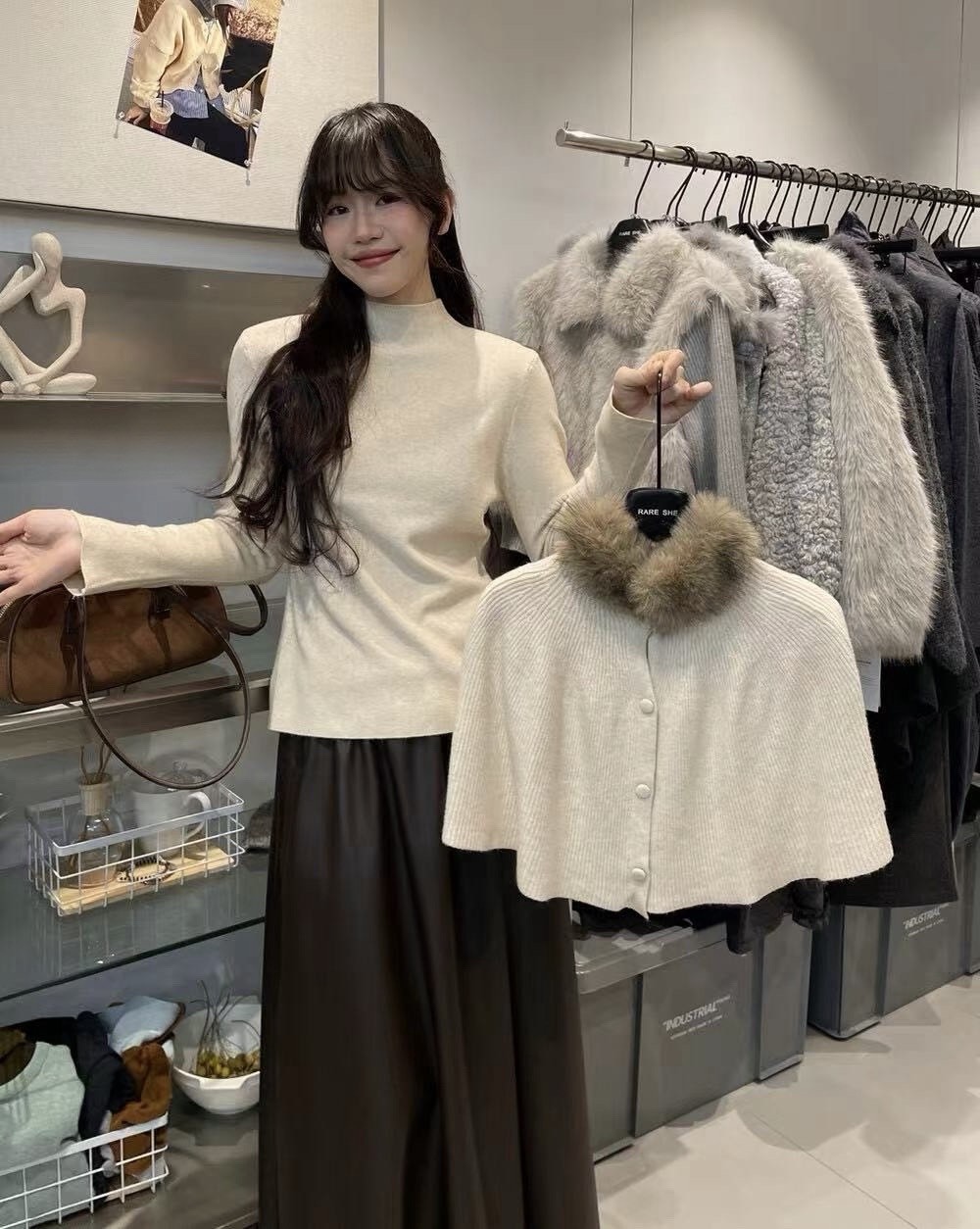 毛領披肩+小細節長袖喇叭袖針織衫」