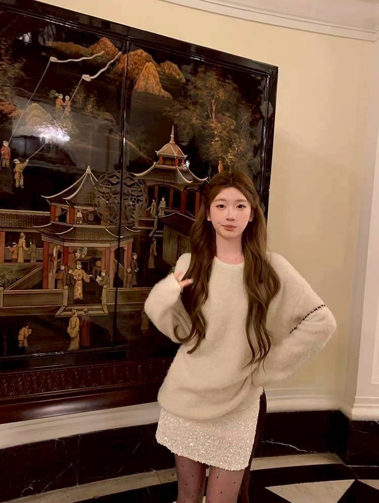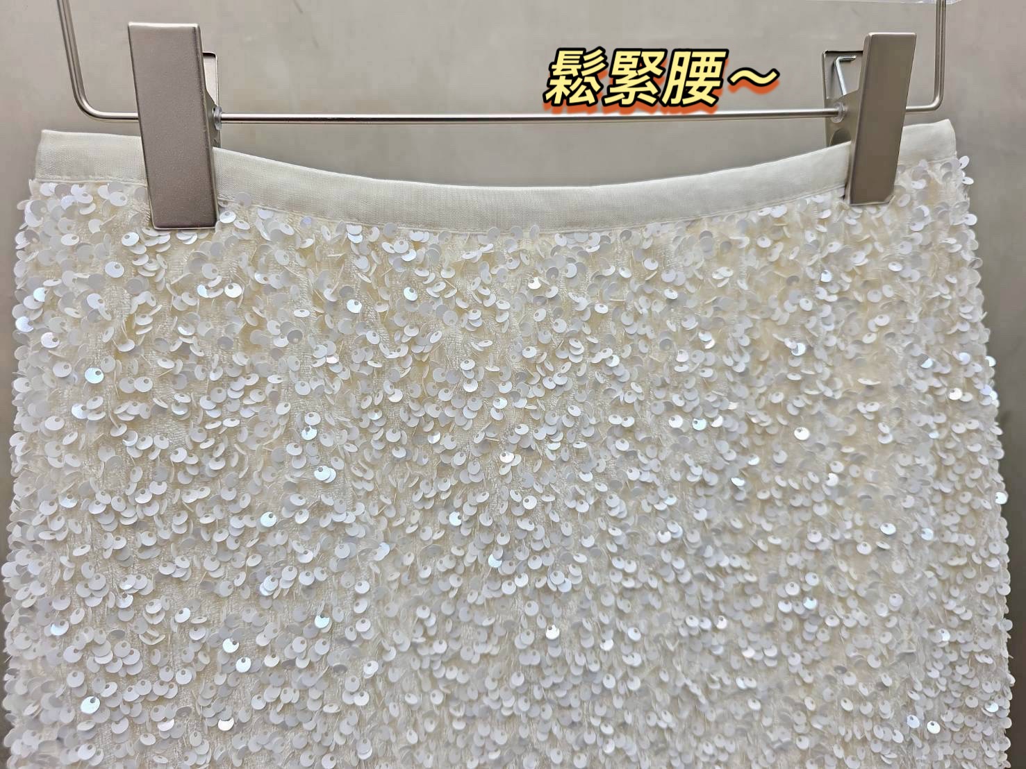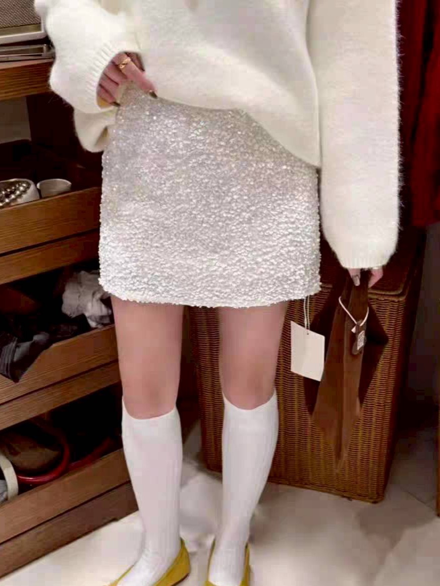 裙子非常適合與軟糯的針織、毛料材質混搭,利用「上啞光、下閃亮」的對比,營造出豐富的層次感