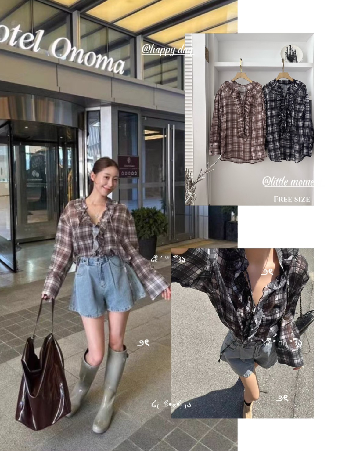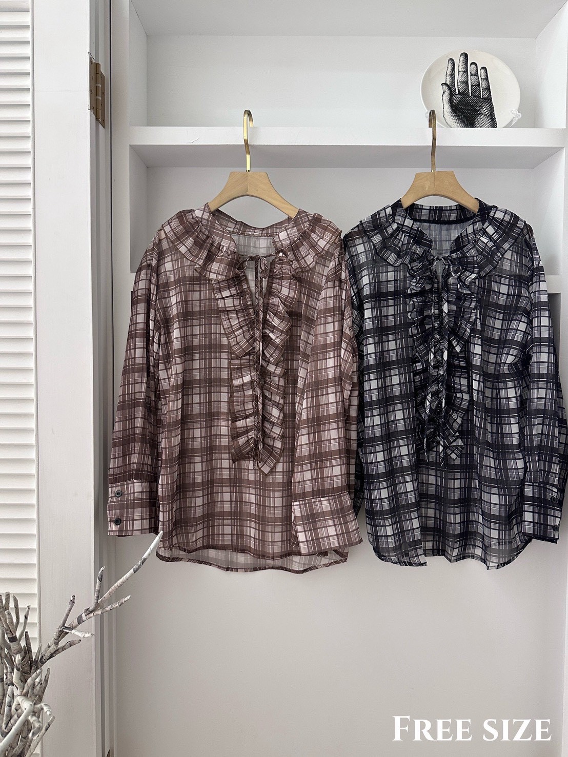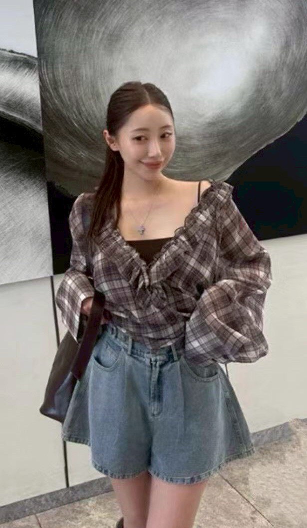 領口延伸至門襟的荷葉邊設計是這件衣服的靈魂,為格紋元素增添了浪漫與優雅的氛圍