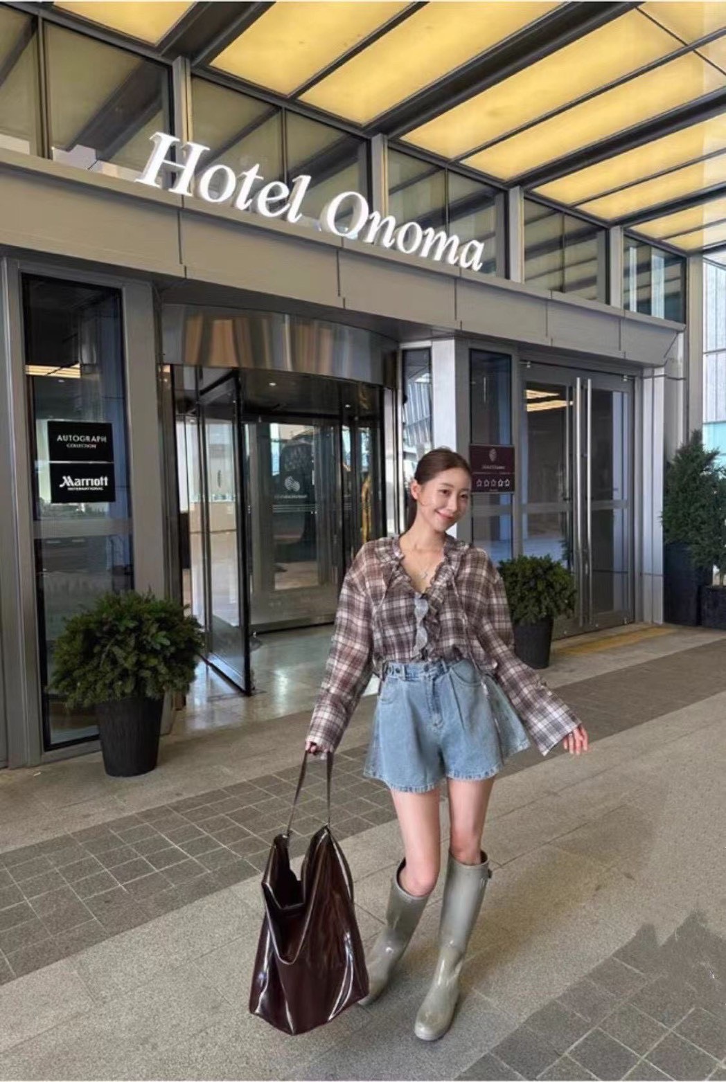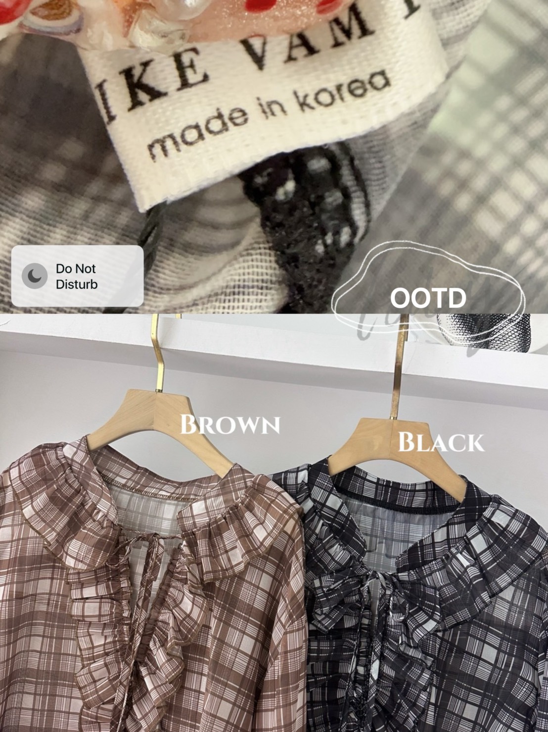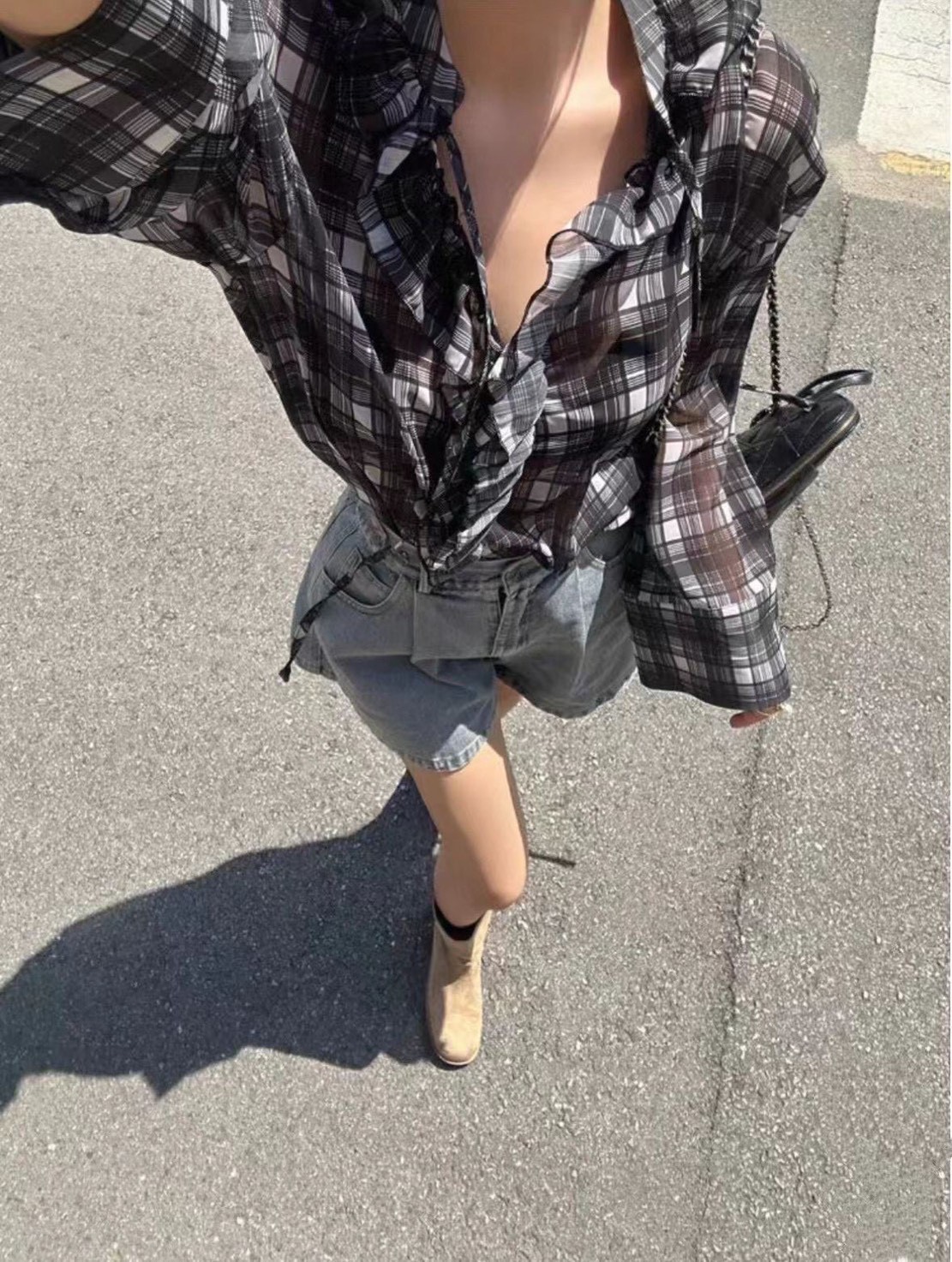 領口延伸至門襟的荷葉邊設計是這件衣服的靈魂,為格紋元素增添了浪漫與優雅的氛圍