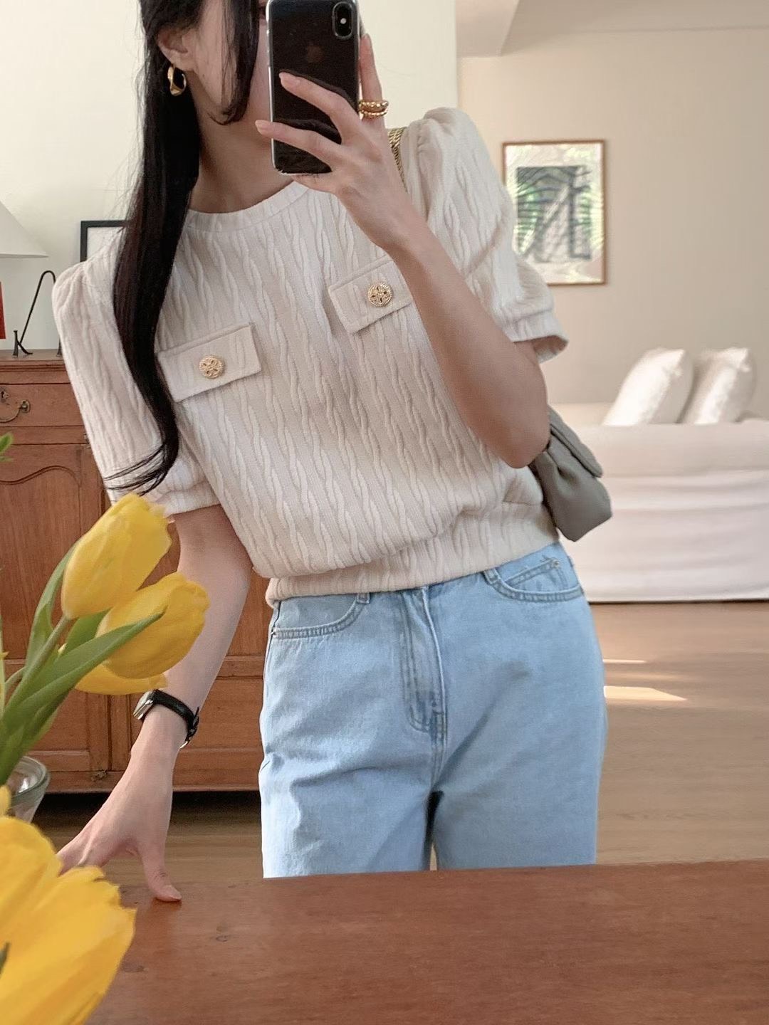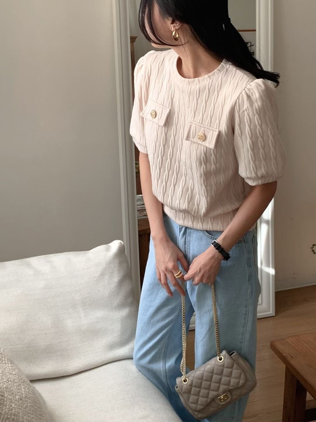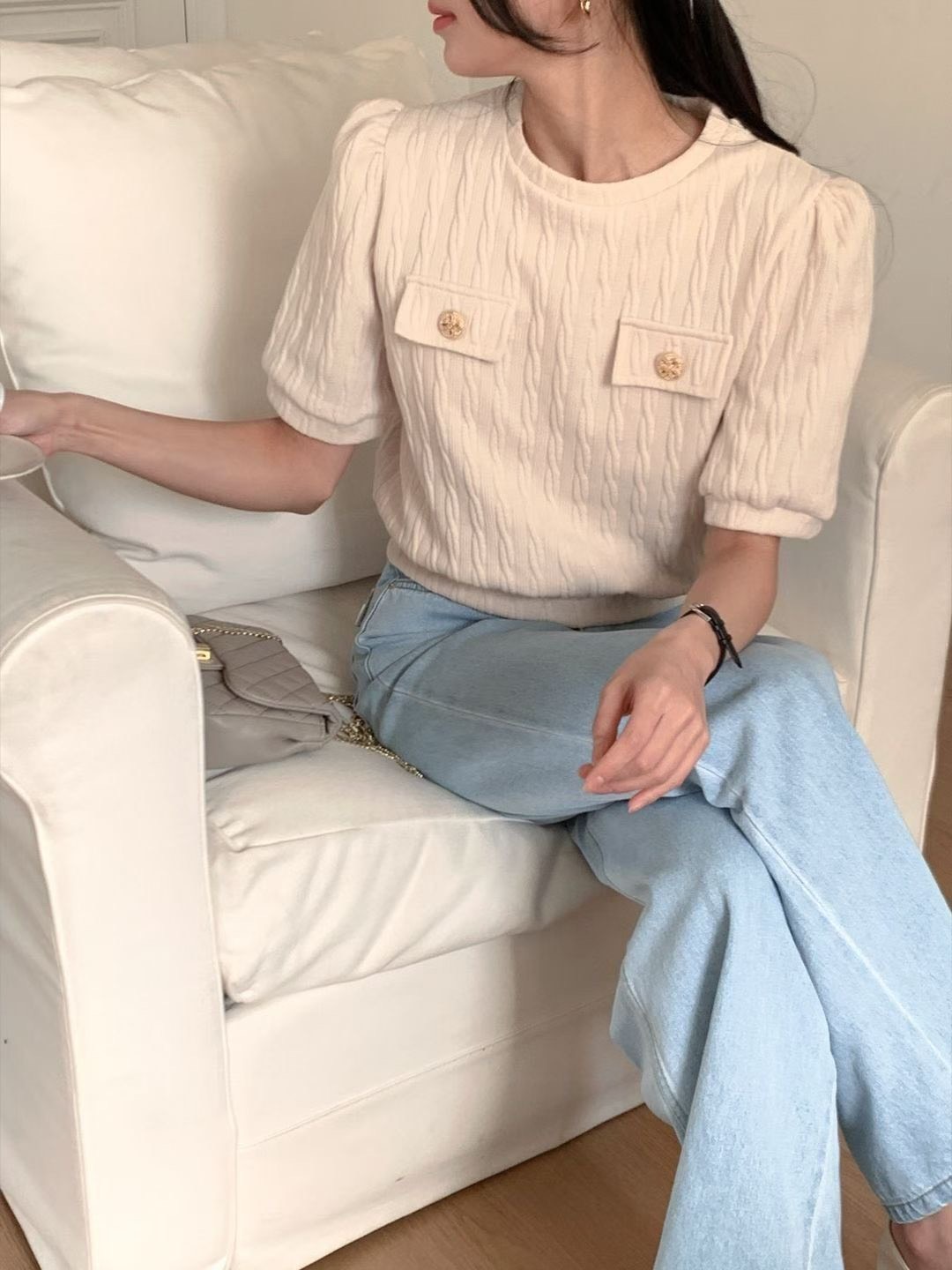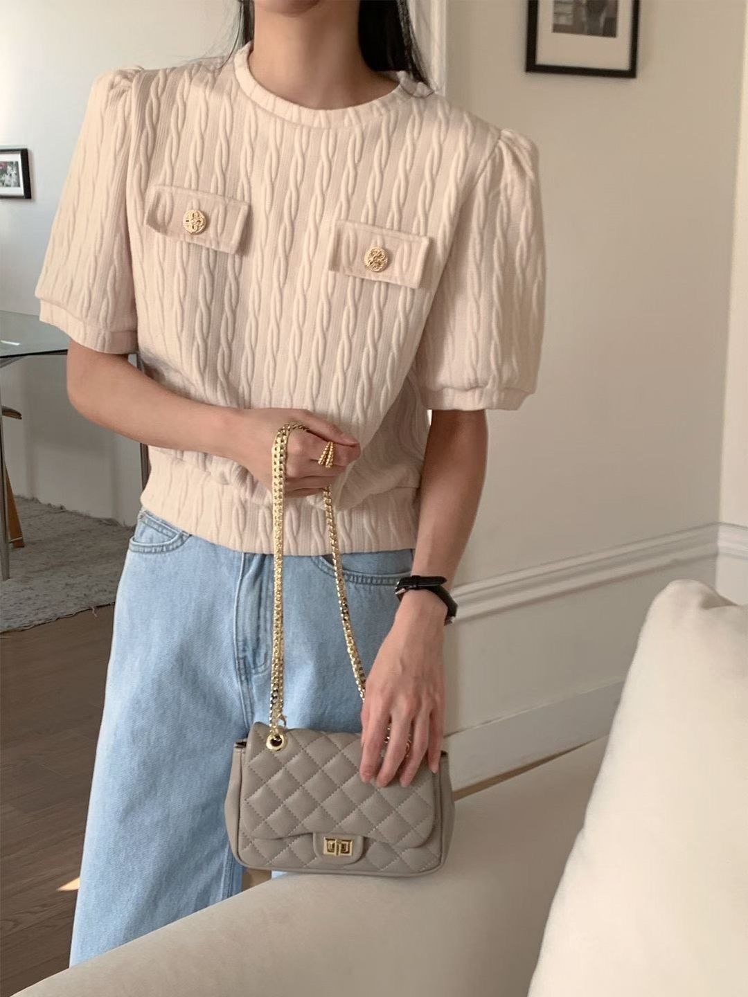 法式名媛風的短袖針織上衣,結合了復古的麻花編織與精緻的金屬扣設計,非常適合想要穿出質感與氣質的場合