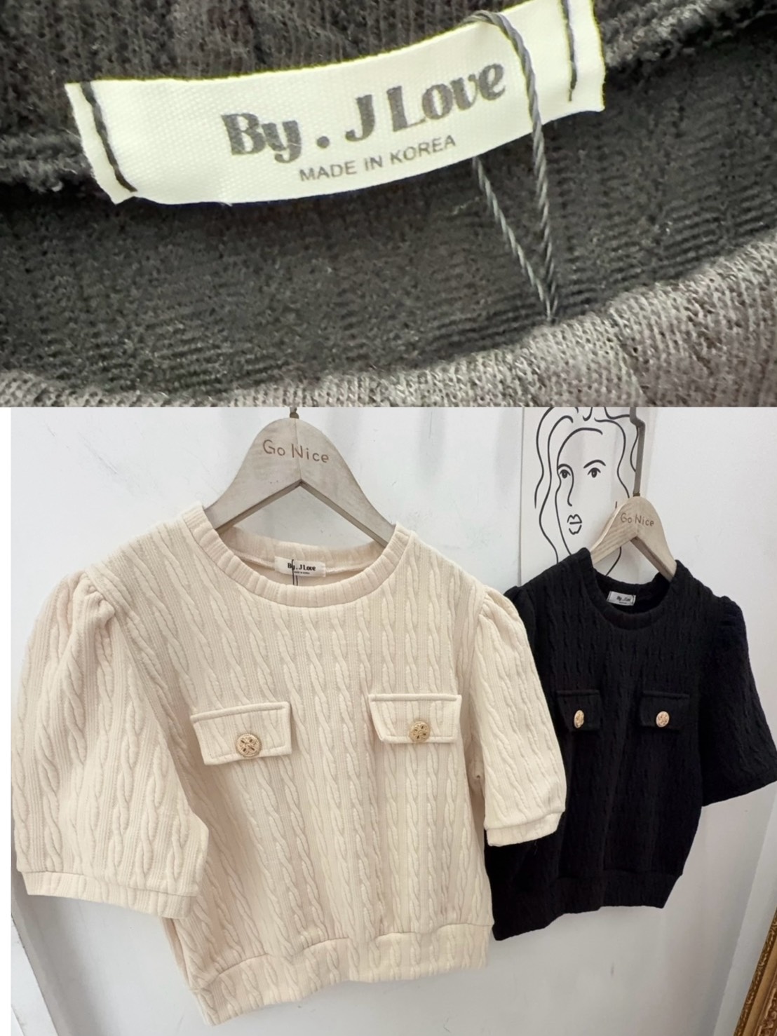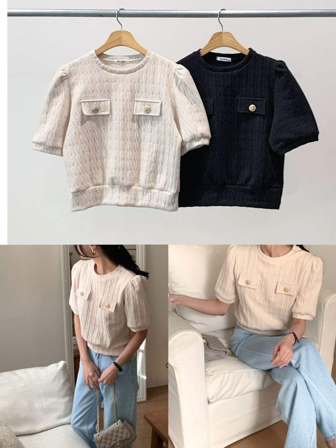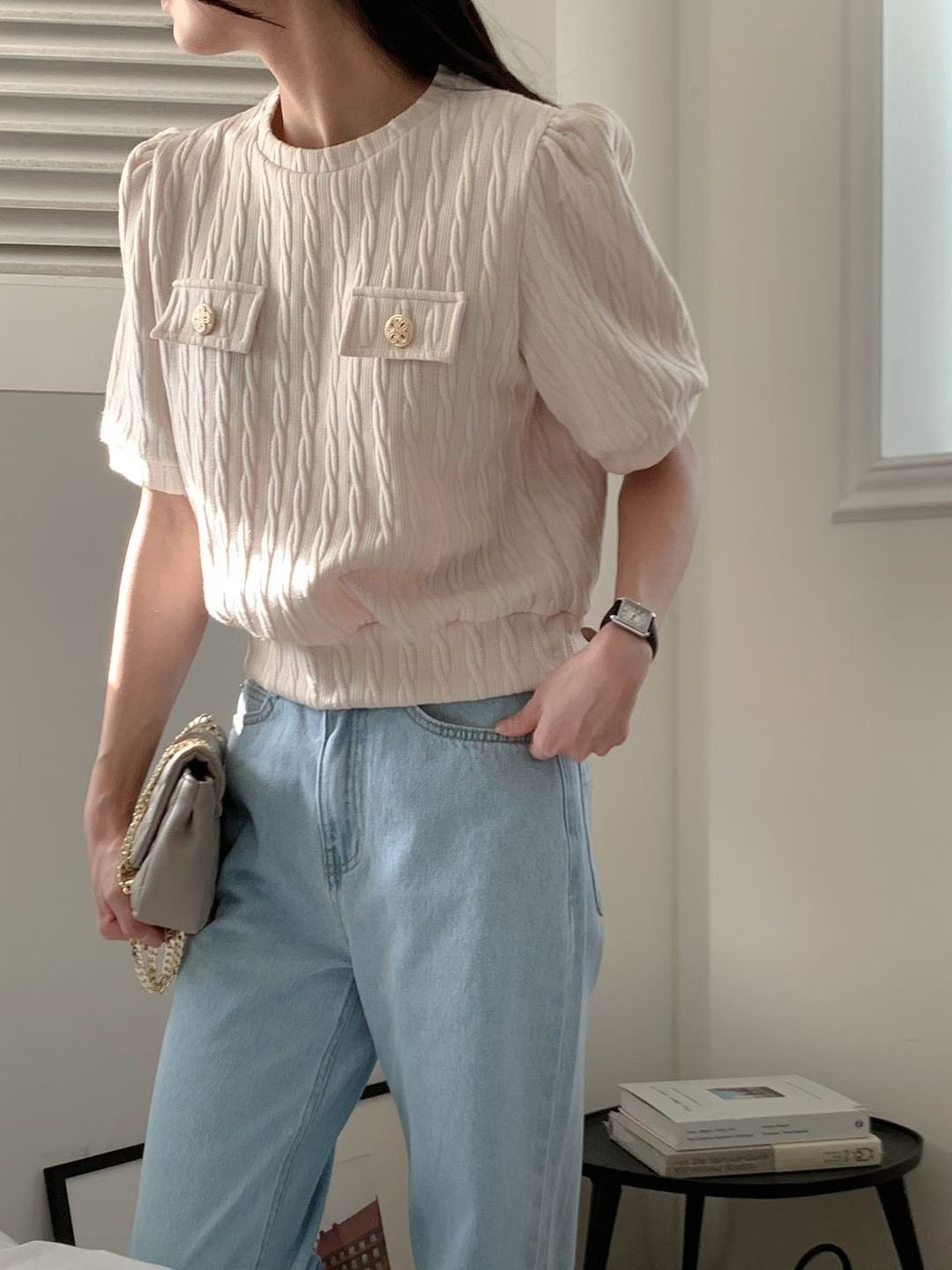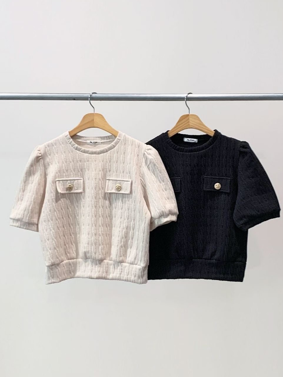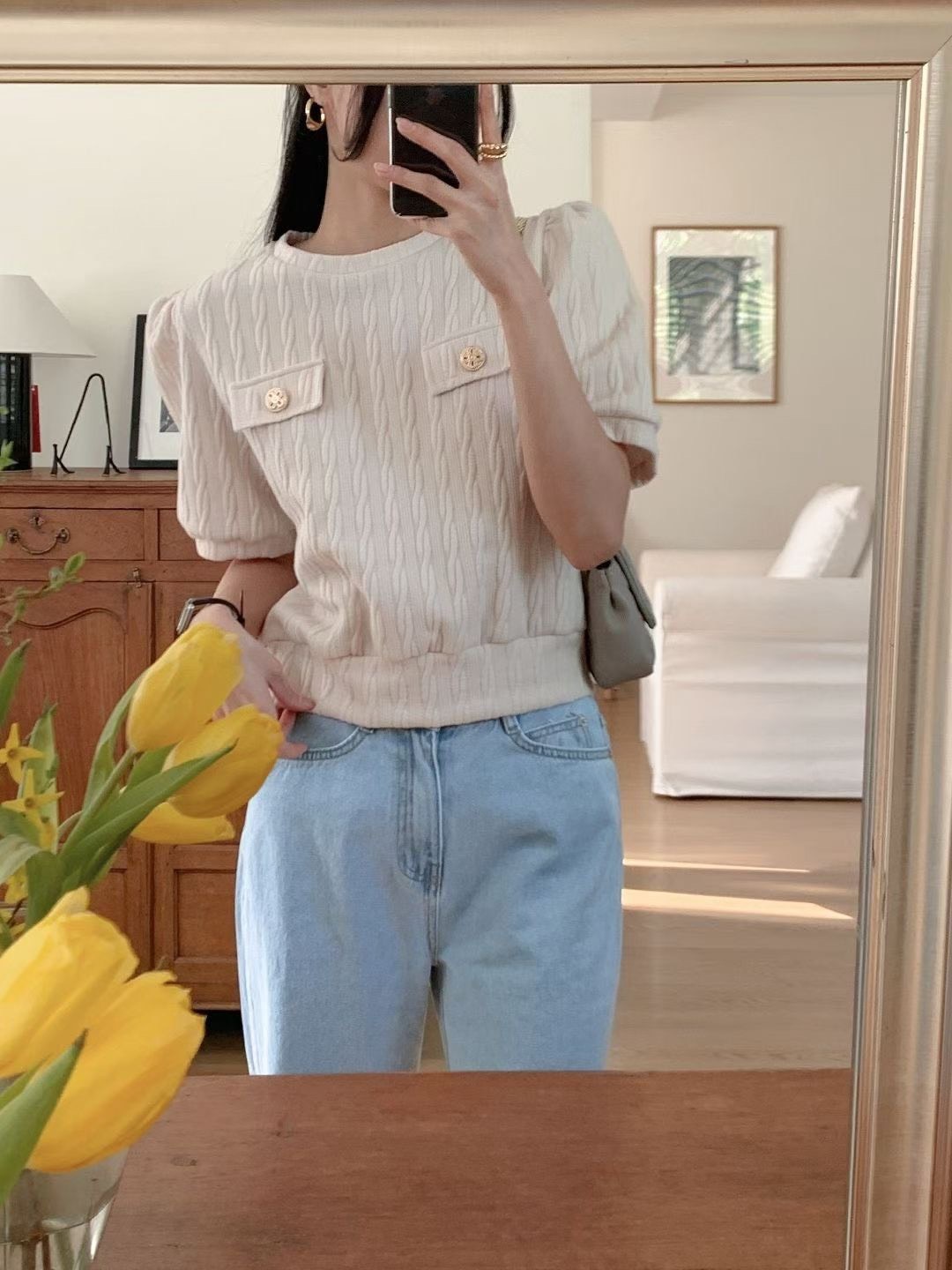 法式名媛風的短袖針織上衣,結合了復古的麻花編織與精緻的金屬扣設計,非常適合想要穿出質感與氣質的場合