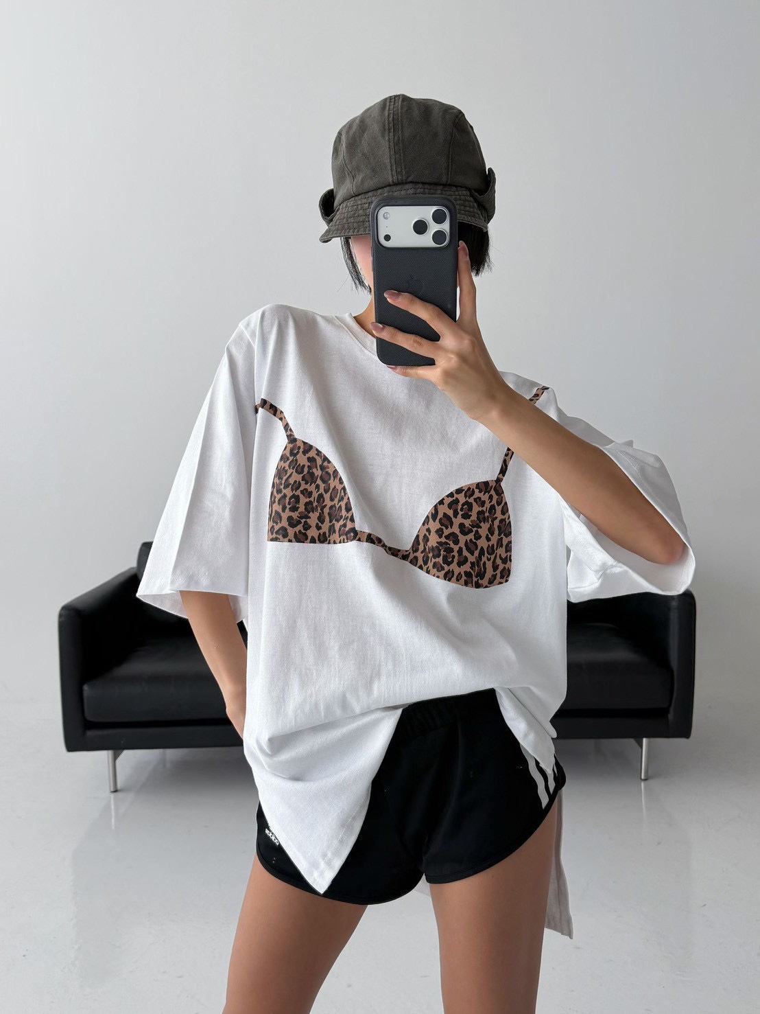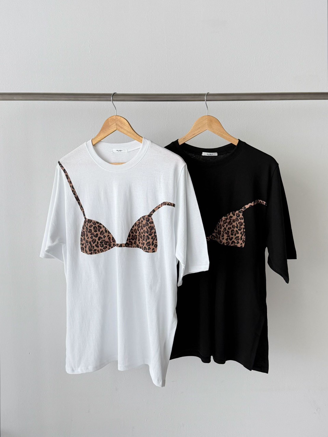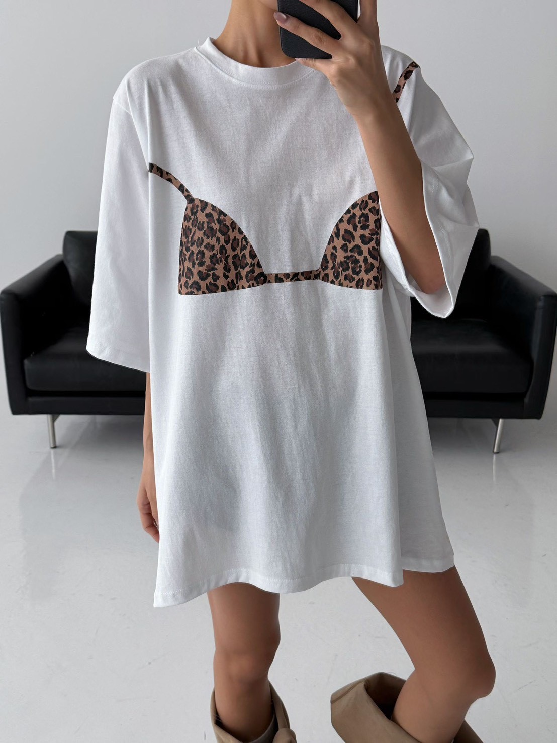 在簡約的寬鬆 T-shirt 上,直接印上了豹紋比基尼的圖案,位置剛好對應人體曲線