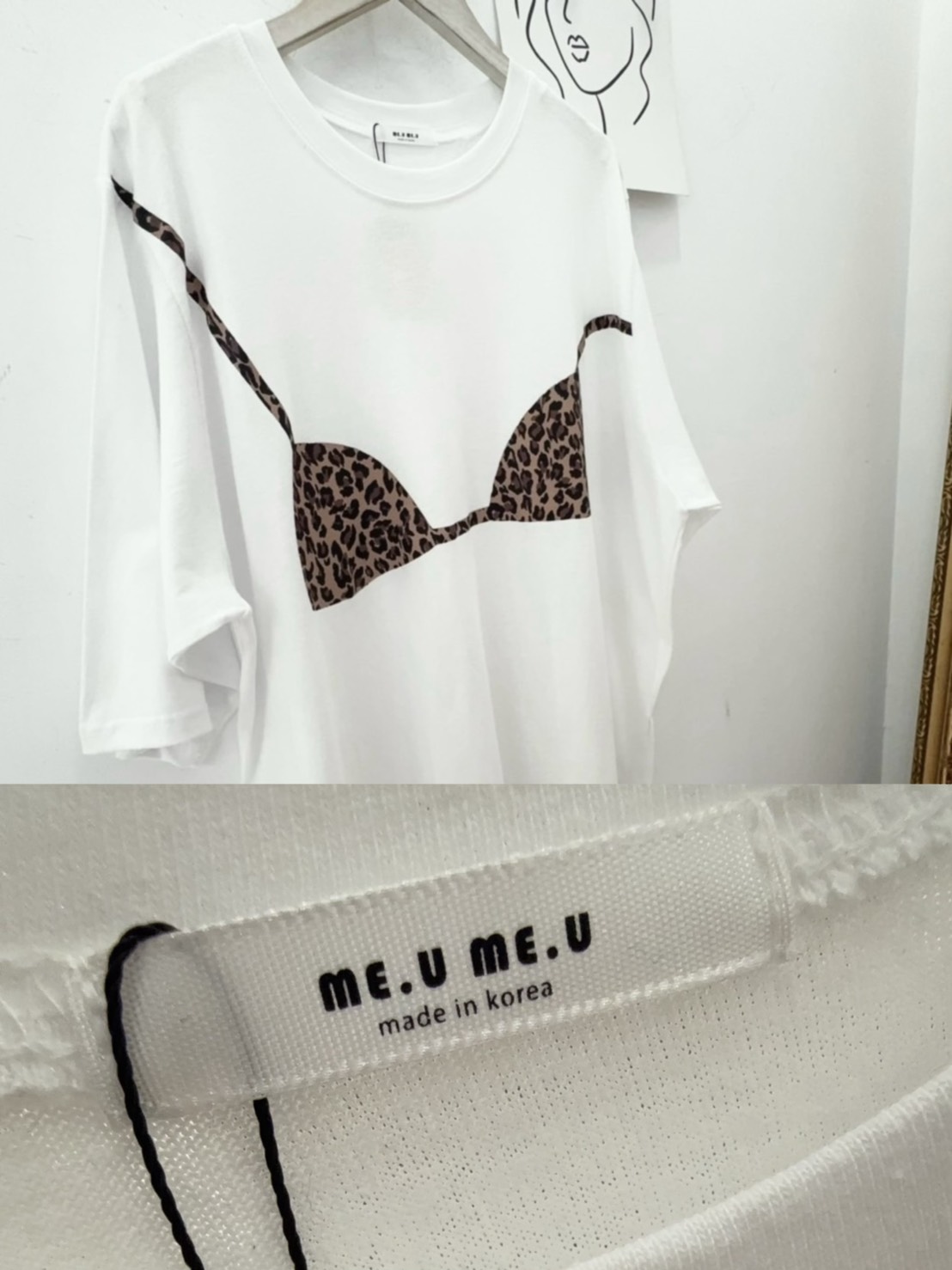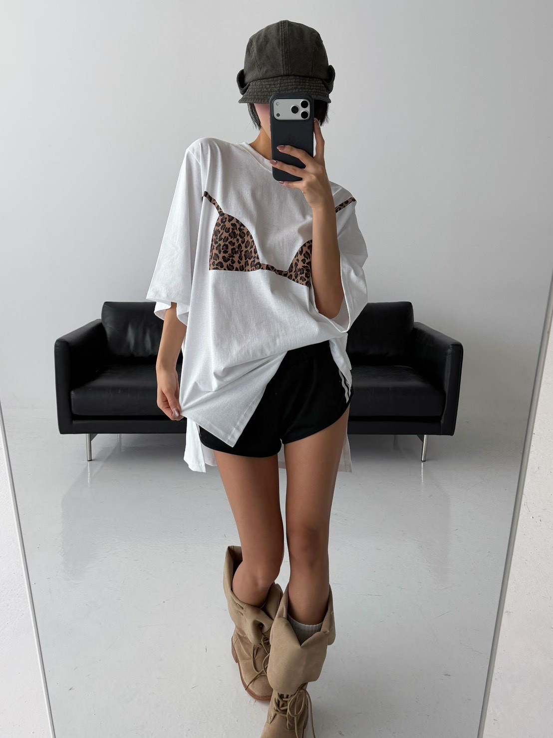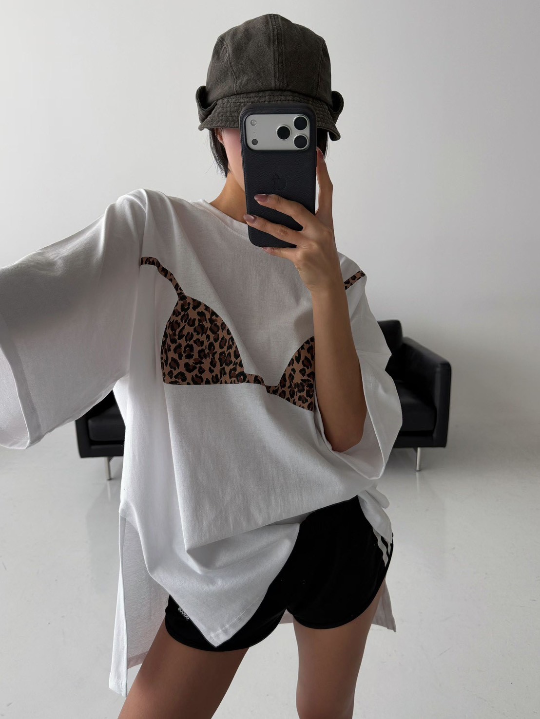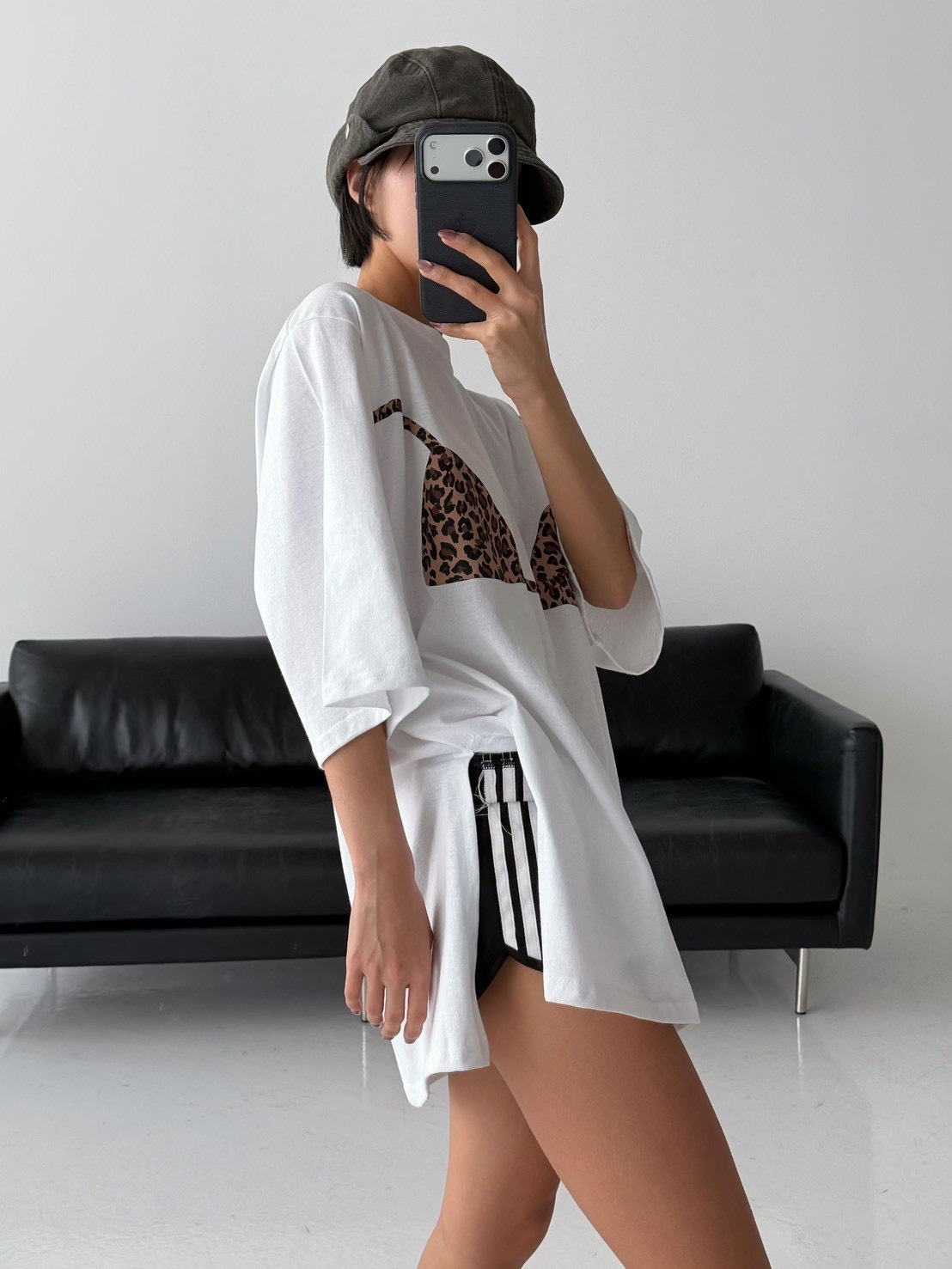 在簡約的寬鬆 T-shirt 上,直接印上了豹紋比基尼的圖案,位置剛好對應人體曲線
