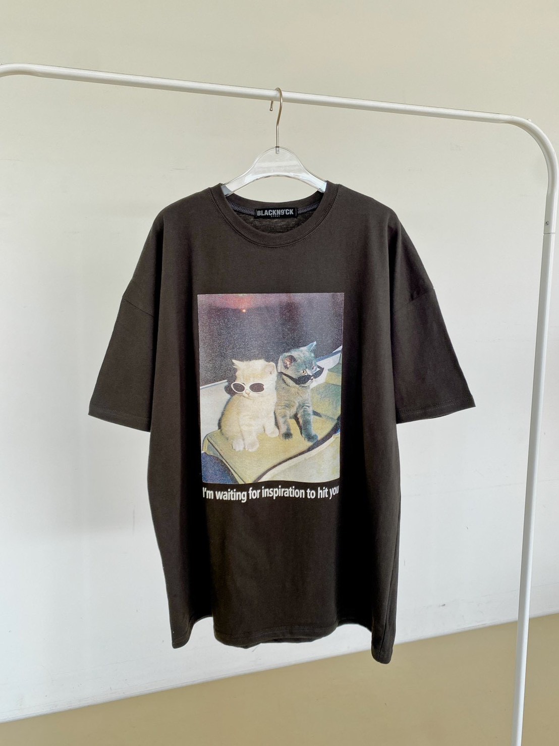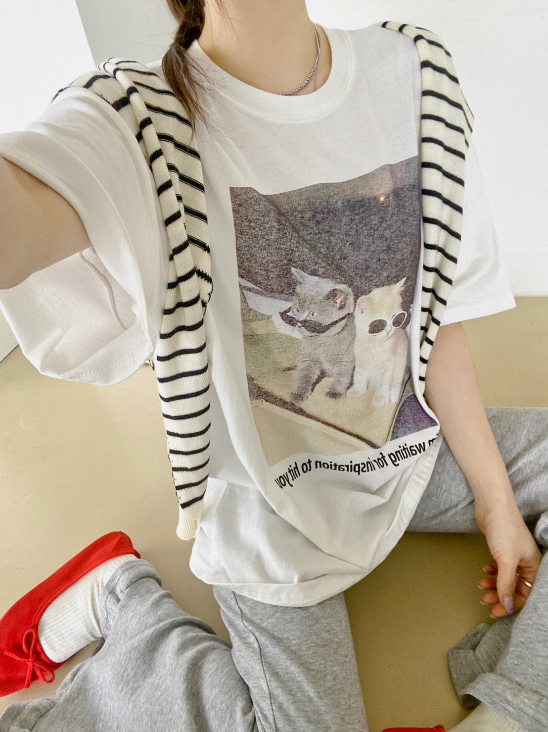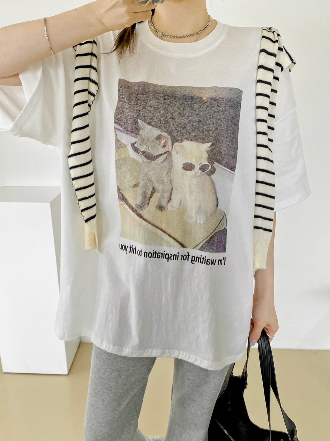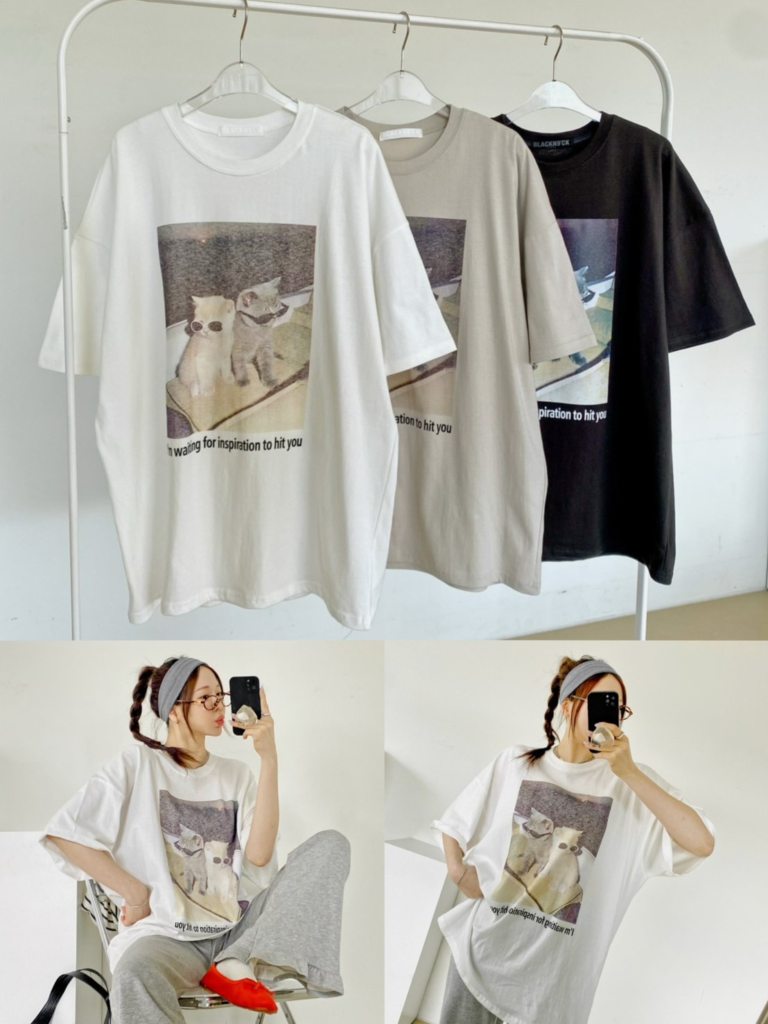 非常流行的 韓系慵懶風,結合了可愛的寵物元素與膠卷濾鏡感,營造出一種既隨性又具備生活的穿搭氛圍 這款單品的靈魂在於其胸前的印花照片,營造出強烈的視覺故事感 兩隻戴著墨鏡的小貓,配上帶有顆粒感的底片視覺