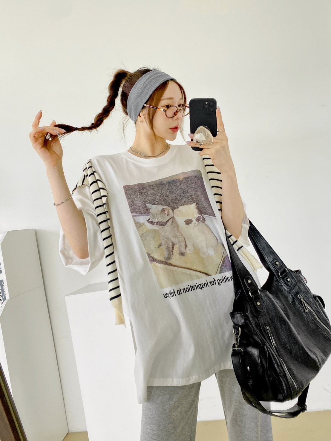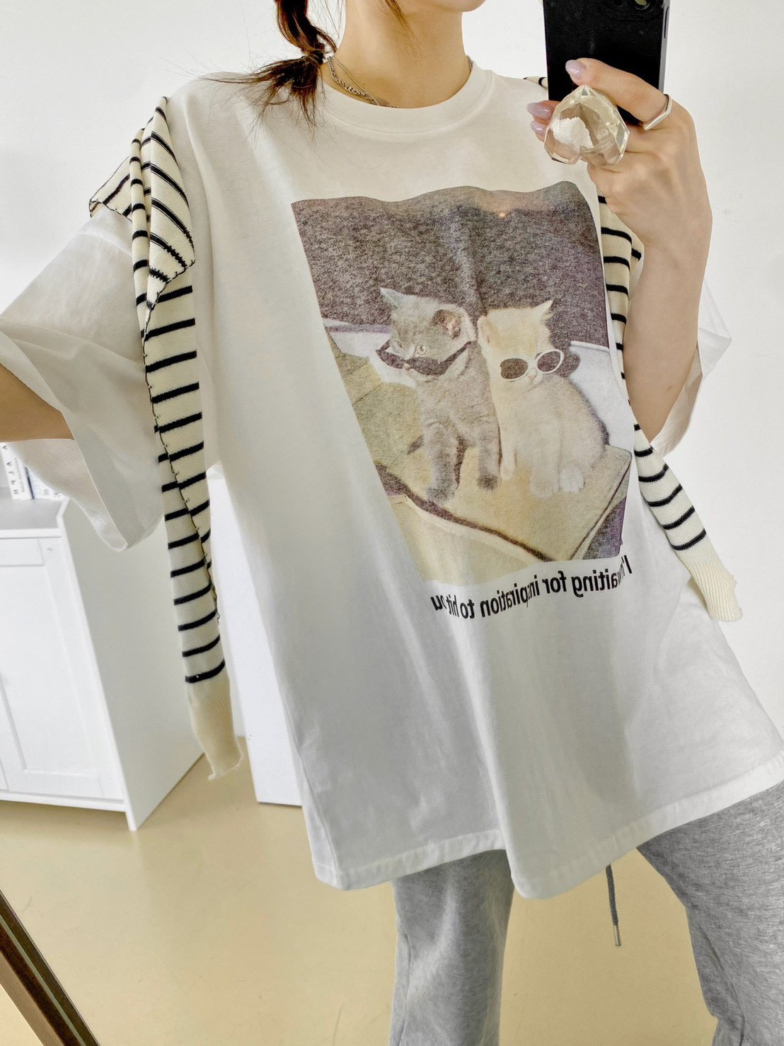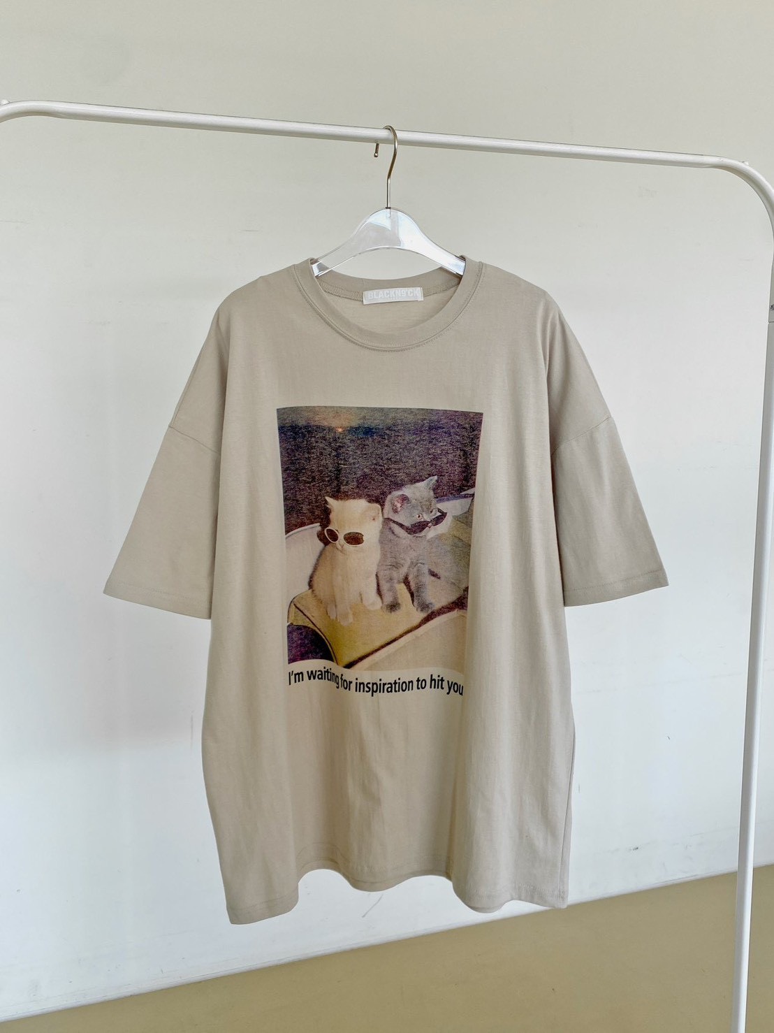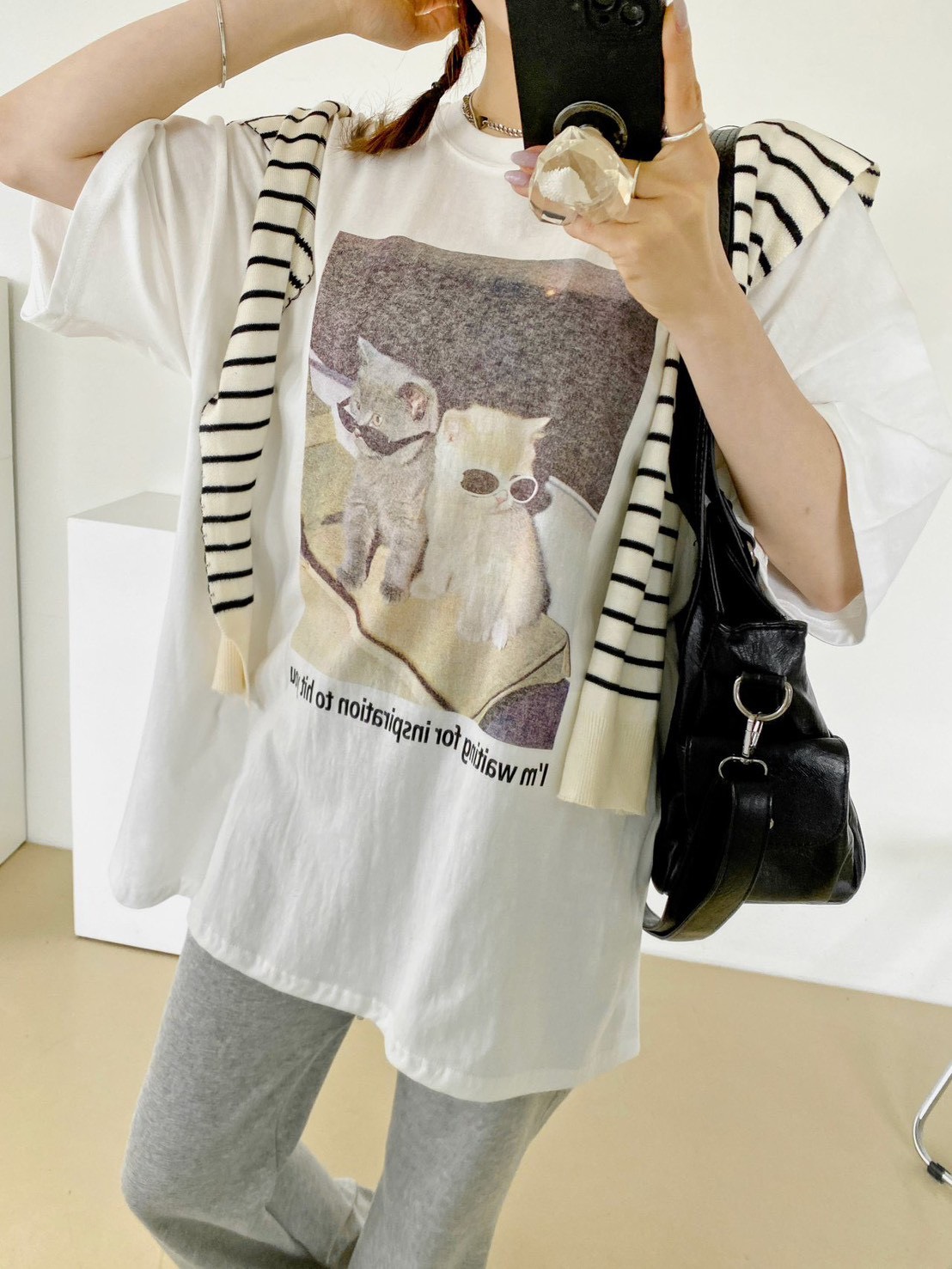 非常流行的 韓系慵懶風,結合了可愛的寵物元素與膠卷濾鏡感,營造出一種既隨性又具備生活的穿搭氛圍 這款單品的靈魂在於其胸前的印花照片,營造出強烈的視覺故事感 兩隻戴著墨鏡的小貓,配上帶有顆粒感的底片視覺