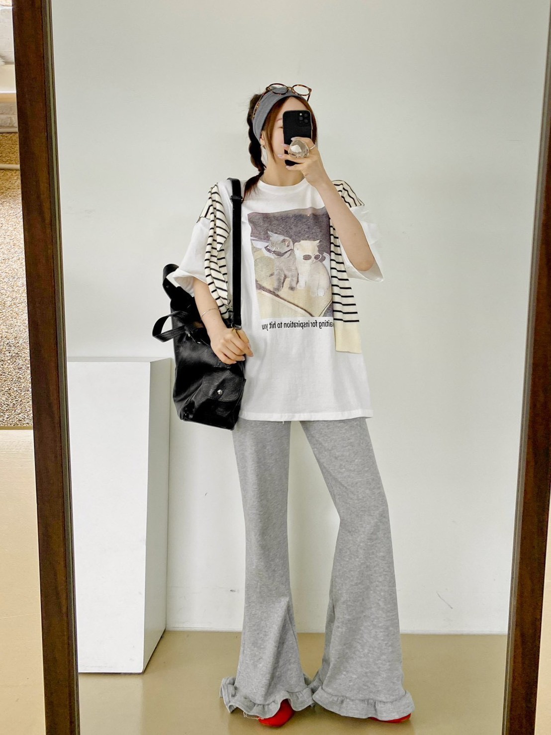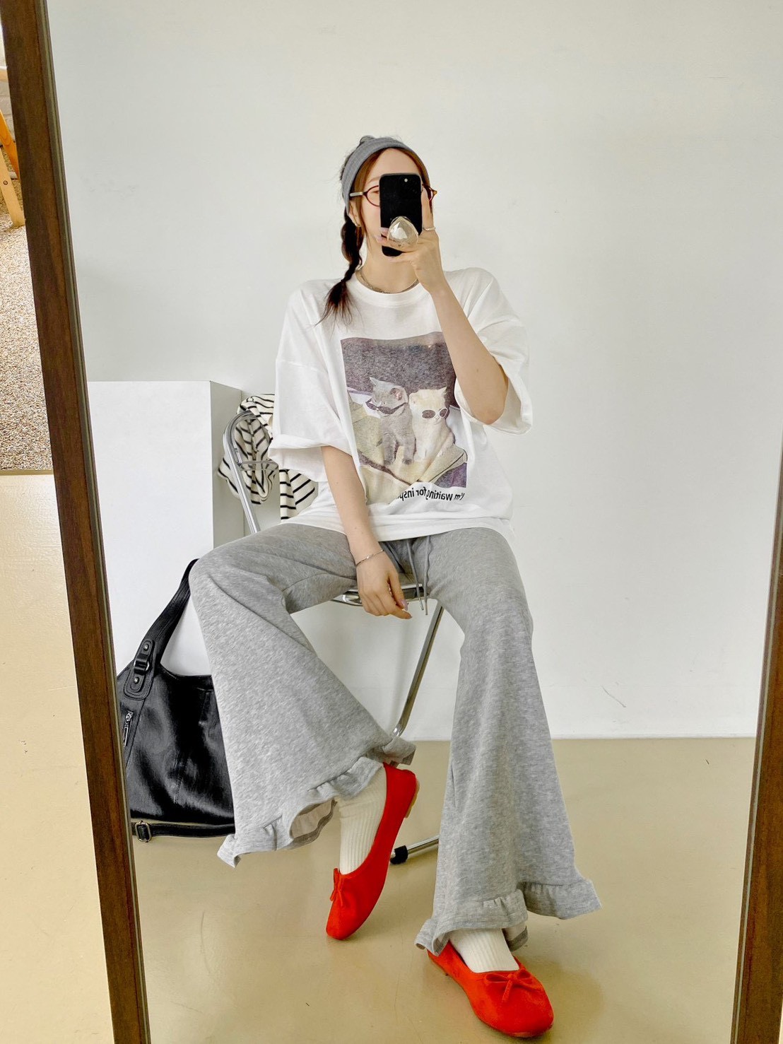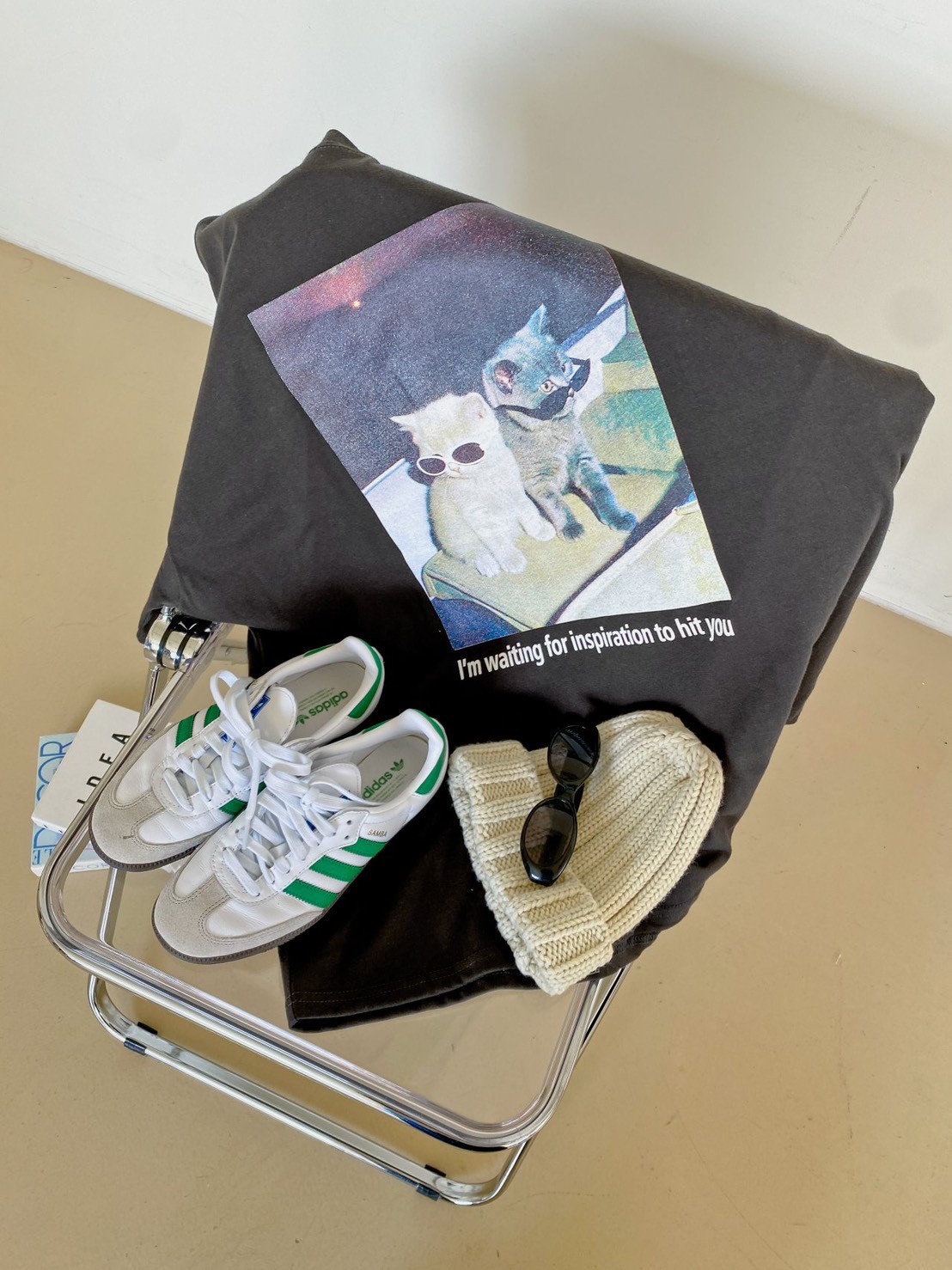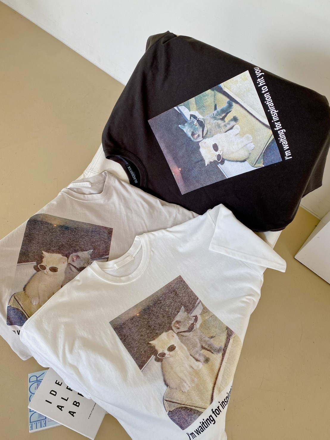 非常流行的 韓系慵懶風,結合了可愛的寵物元素與膠卷濾鏡感,營造出一種既隨性又具備生活的穿搭氛圍 這款單品的靈魂在於其胸前的印花照片,營造出強烈的視覺故事感 兩隻戴著墨鏡的小貓,配上帶有顆粒感的底片視覺