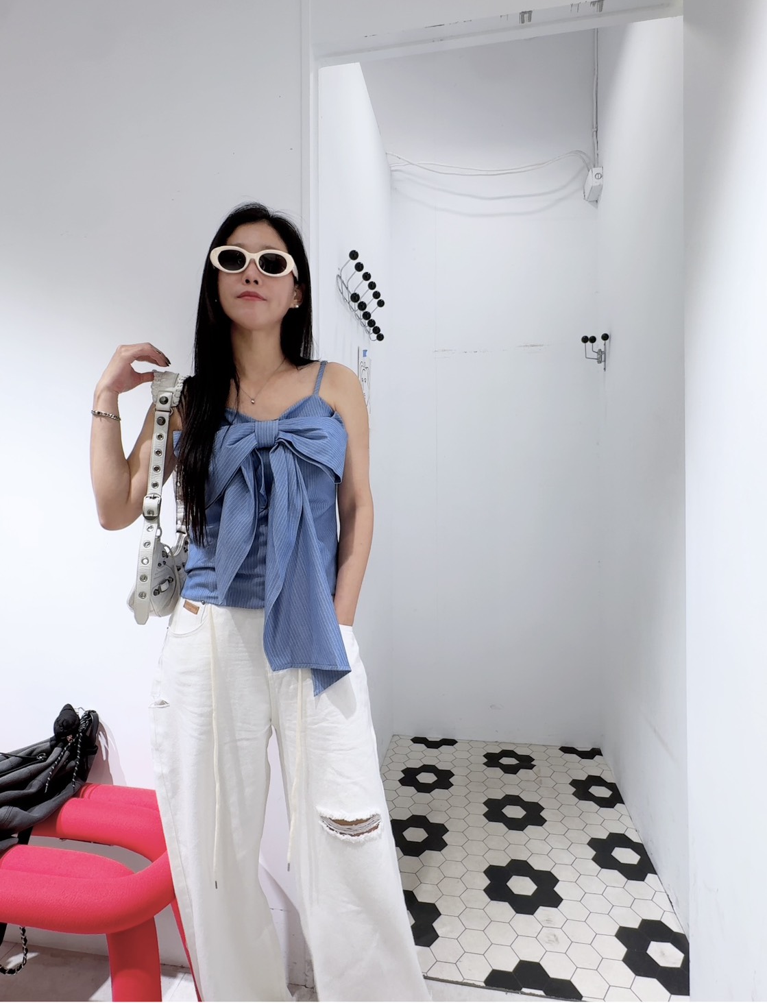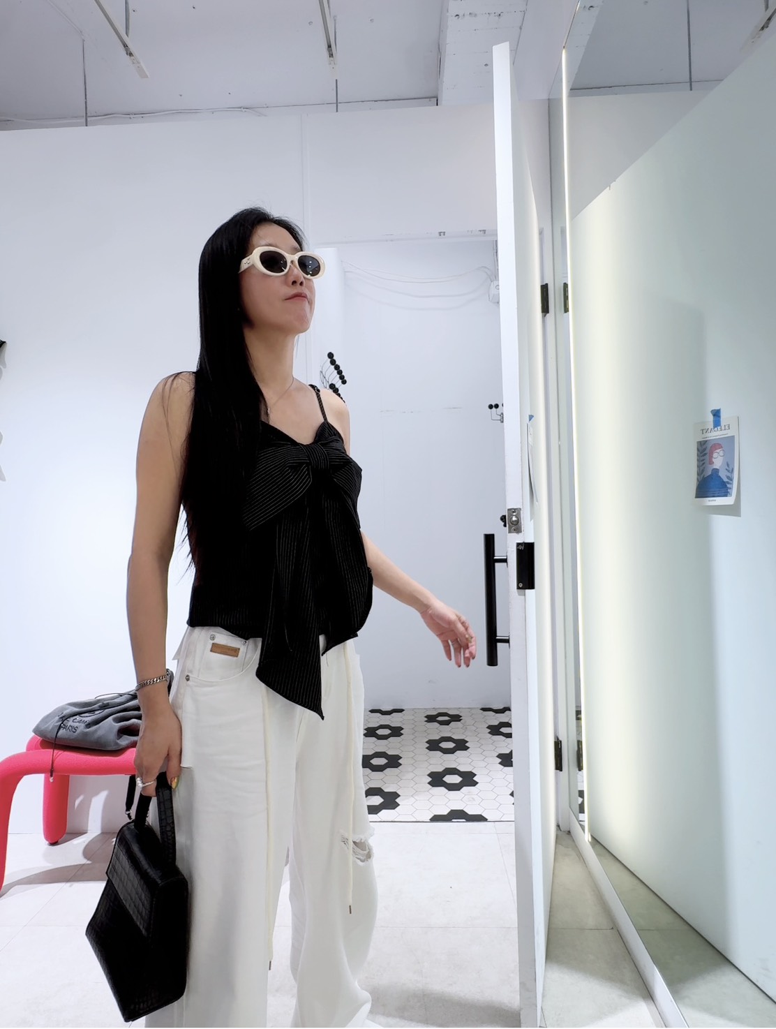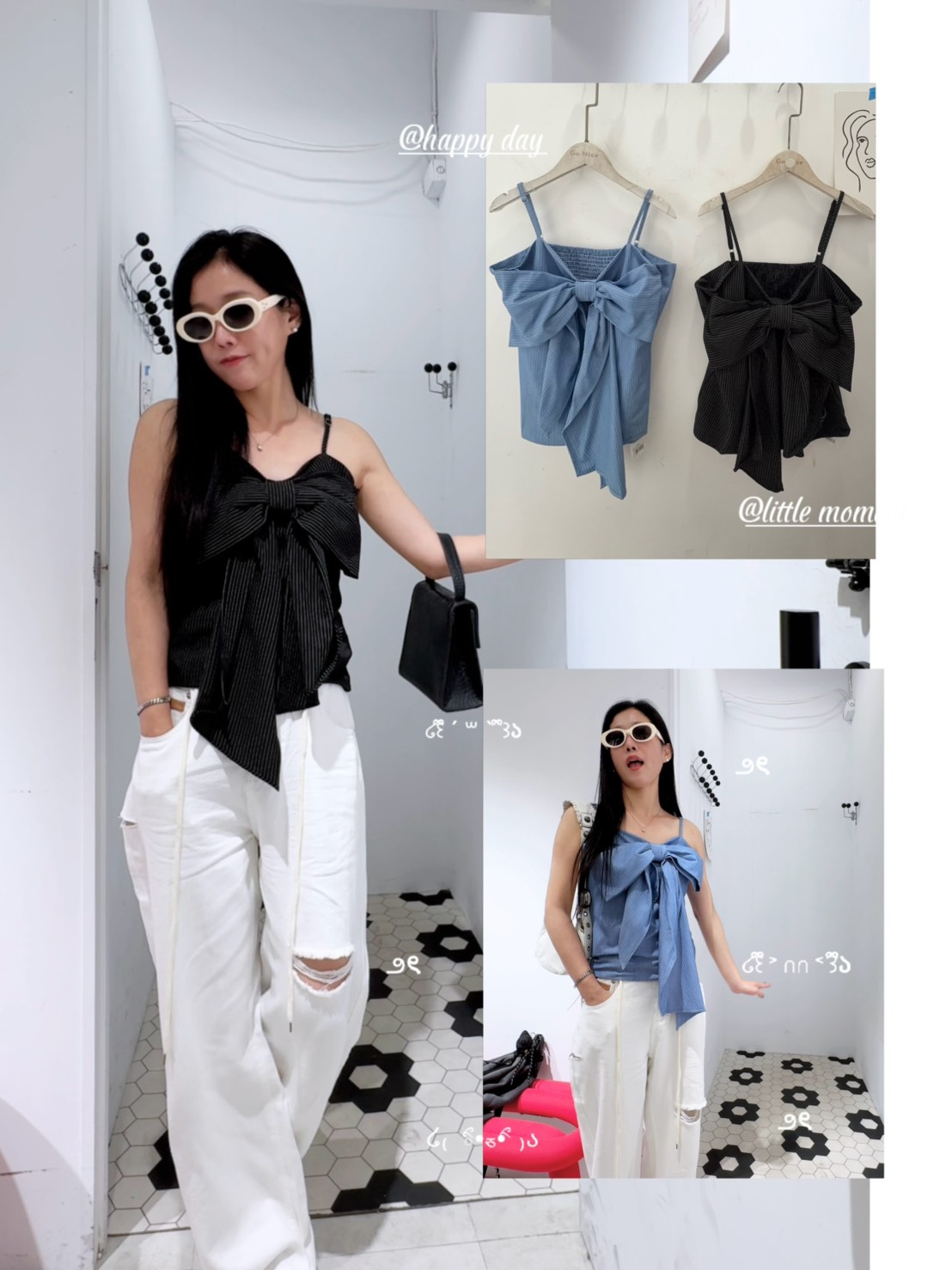 結合了甜美蝴蝶結與俐落條紋兩種截然不同的元素,呈現出一種「甜酷風」的質感