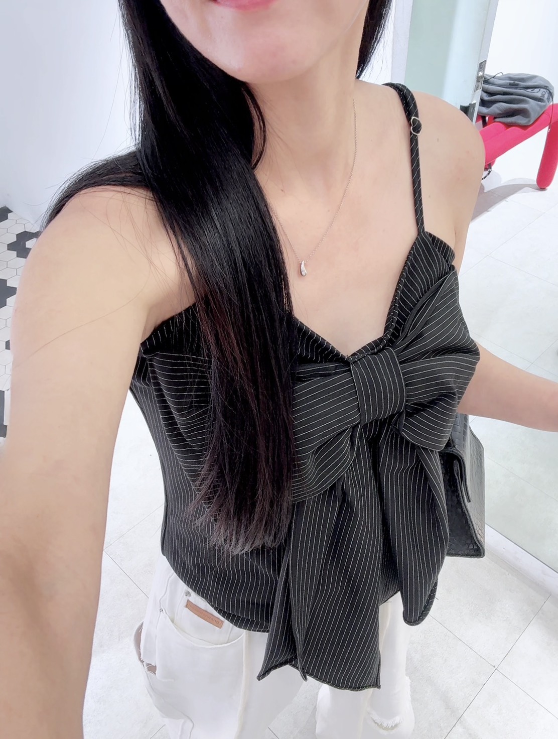 採用了西裝面料常見的細直條紋,中和了蝴蝶結的可愛感,增添了一份優雅與洗鍊
